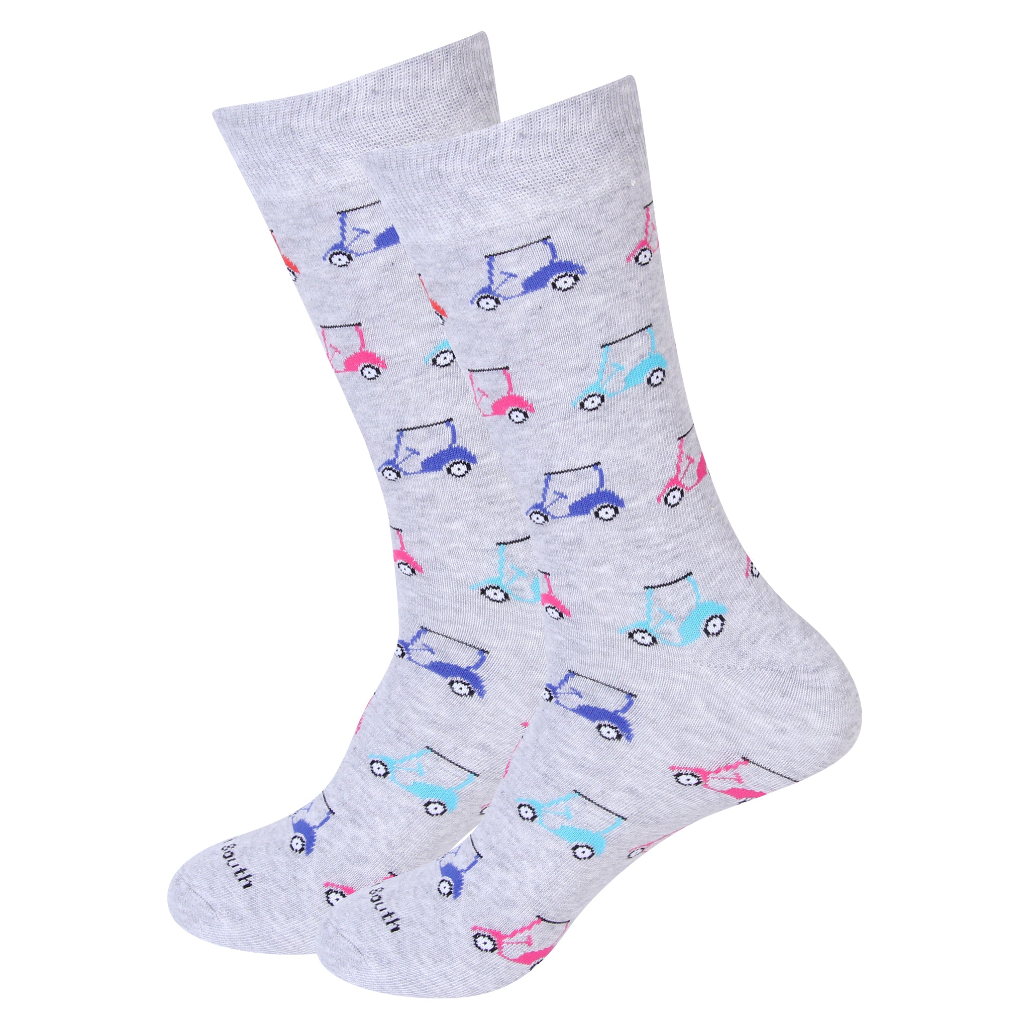 Drive your style to the next hole with the Multi Color Golf Cart Socks, featuring a lively repeating pattern of colorful golf carts set against a sleek grey background. These socks are perfect for golf enthusiasts, casual players, and anyone who loves adding a fun, sporty twist to their everyday wardrobe.