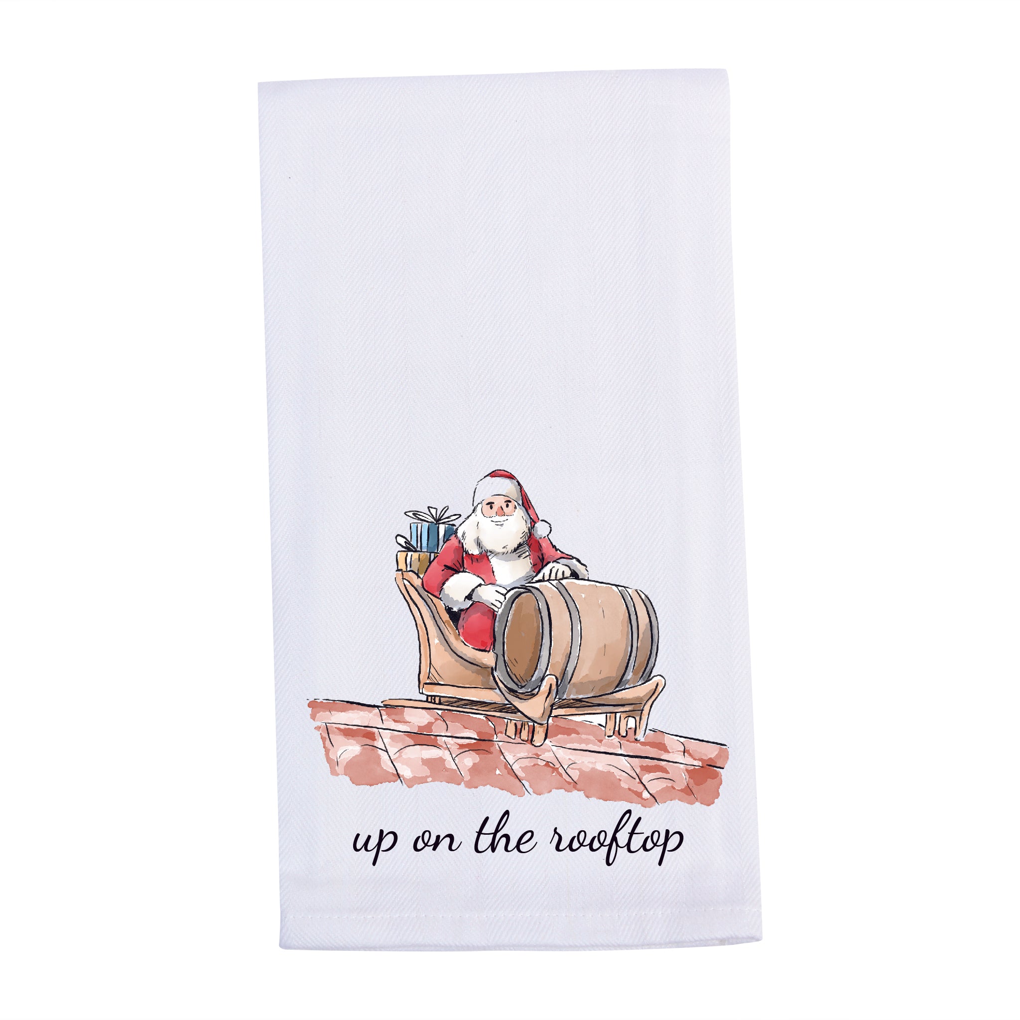 Bring holiday cheer with a twist of southern charm using the Up on the Rooftop Santa and Bourbon Christmas Tea Towel, featuring a festive illustration of Santa Claus perched atop a rooftop, holding a classic bourbon barrel. Perfect for bourbon lovers, holiday enthusiasts, and fans of unique Christmas décor, this tea towel adds a playful and spirited touch to your kitchen festivities.