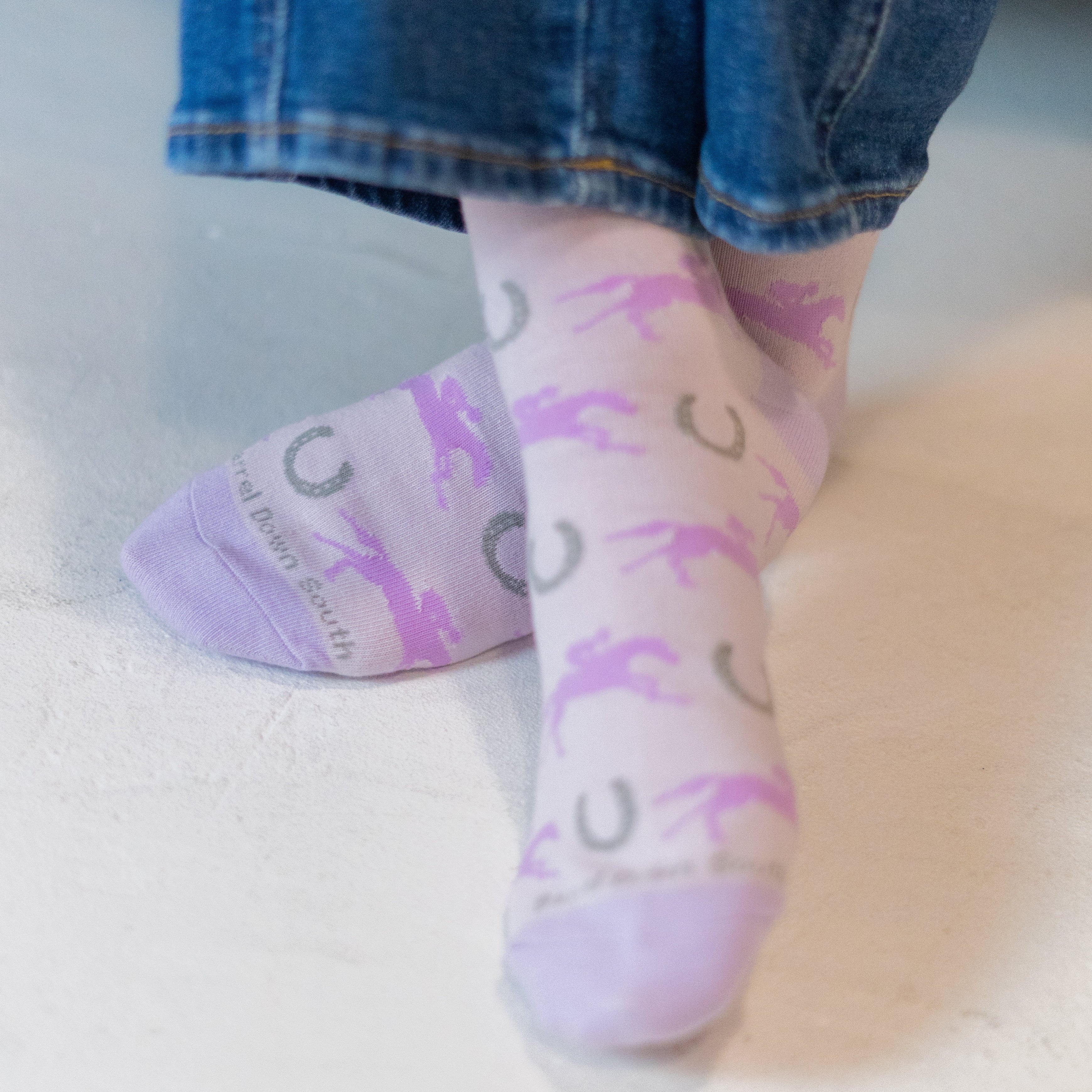 Make every step a statement with these Purple Kentucky Derby and Horseshoe Socks, featuring a playful, repeating pattern of mid-race jockeys and classic horseshoes in vibrant pink outlines set against a soft blush backdrop. Whether you're headed to the Kentucky Derby, brunching with flair, or just want to add a touch of equestrian charm to your wardrobe, these socks deliver high-style with a nod to Southern tradition.