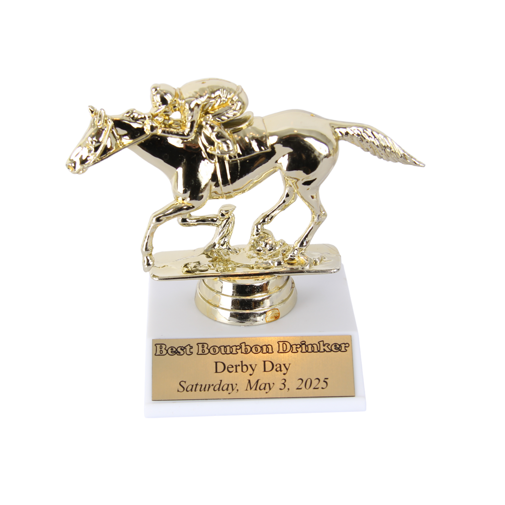 Celebrate the ultimate bourbon enthusiast with this unique trophy showcasing a horse’s rear view and a plaque engraved: Best Bourbon Drinker Derby Day. It’s the perfect award to honor those who savor their bourbon with style and spirit.