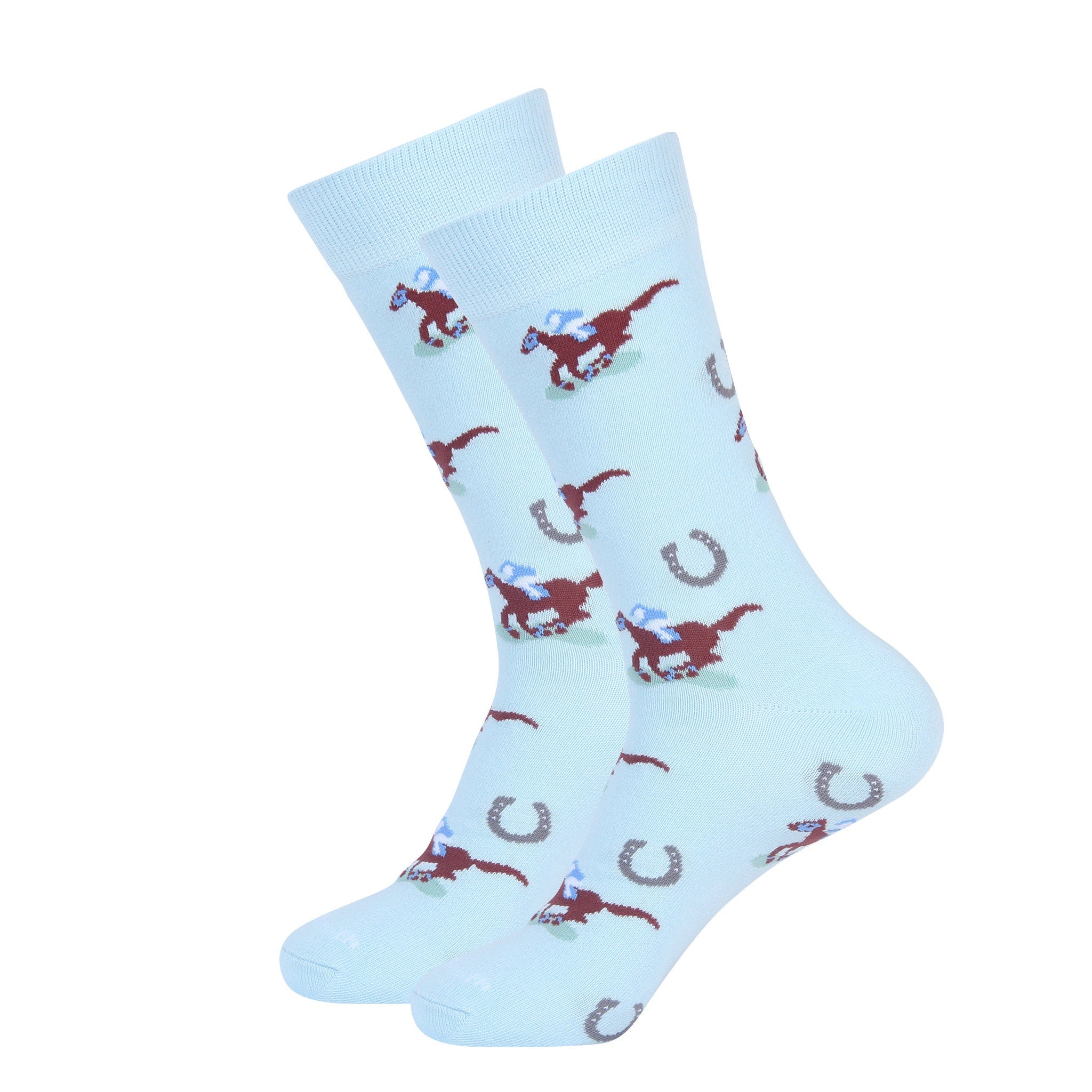Step into style and comfort with our Blue Raceday Socks, adorned with an elegant pattern of running thoroughbred horses and lucky horseshoes. Crafted from a premium blend of soft, breathable cotton, these socks offer all-day comfort and a snug fit. The playful yet sophisticated design adds a touch of personality to any outfit, making them perfect for both casual wear and special occasions. Whether you're a horse enthusiast or simply looking to elevate your sock game, these charming socks are a perfect addition to your wardrobe.