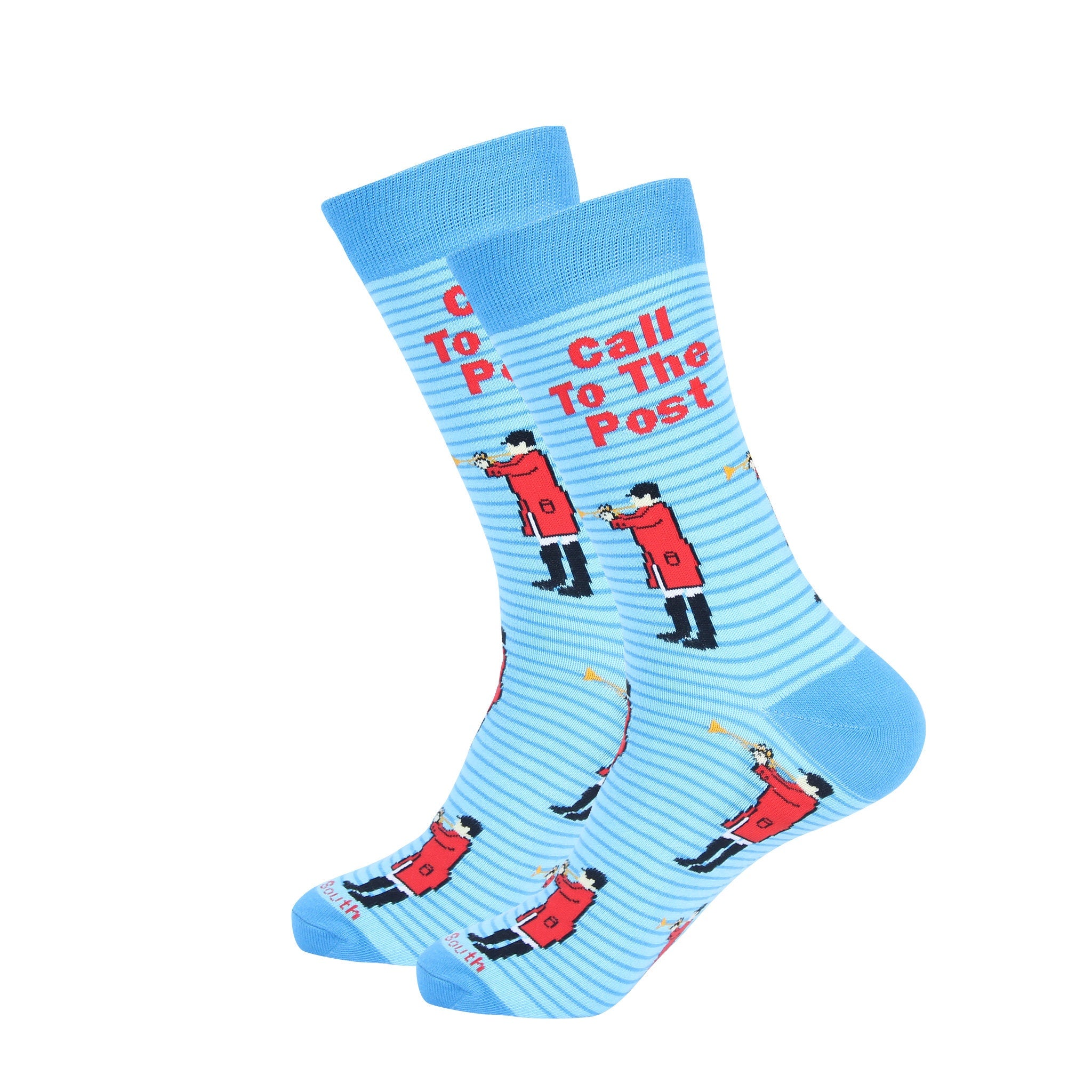 Sound the trumpet for standout style with our Blue Striped Call to the Post Socks, featuring a lively repeating pattern of iconic derby buglers set against classic blue racing stripes, topped with the unmistakable phrase “Call to the Post.” Perfect for Kentucky Derby lovers, horse racing fans, and anyone who appreciates the rich tradition of the track, these socks deliver bold energy and timeless charm.