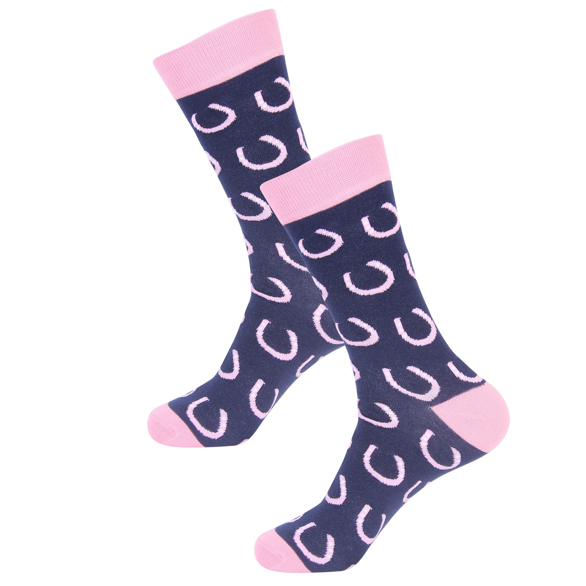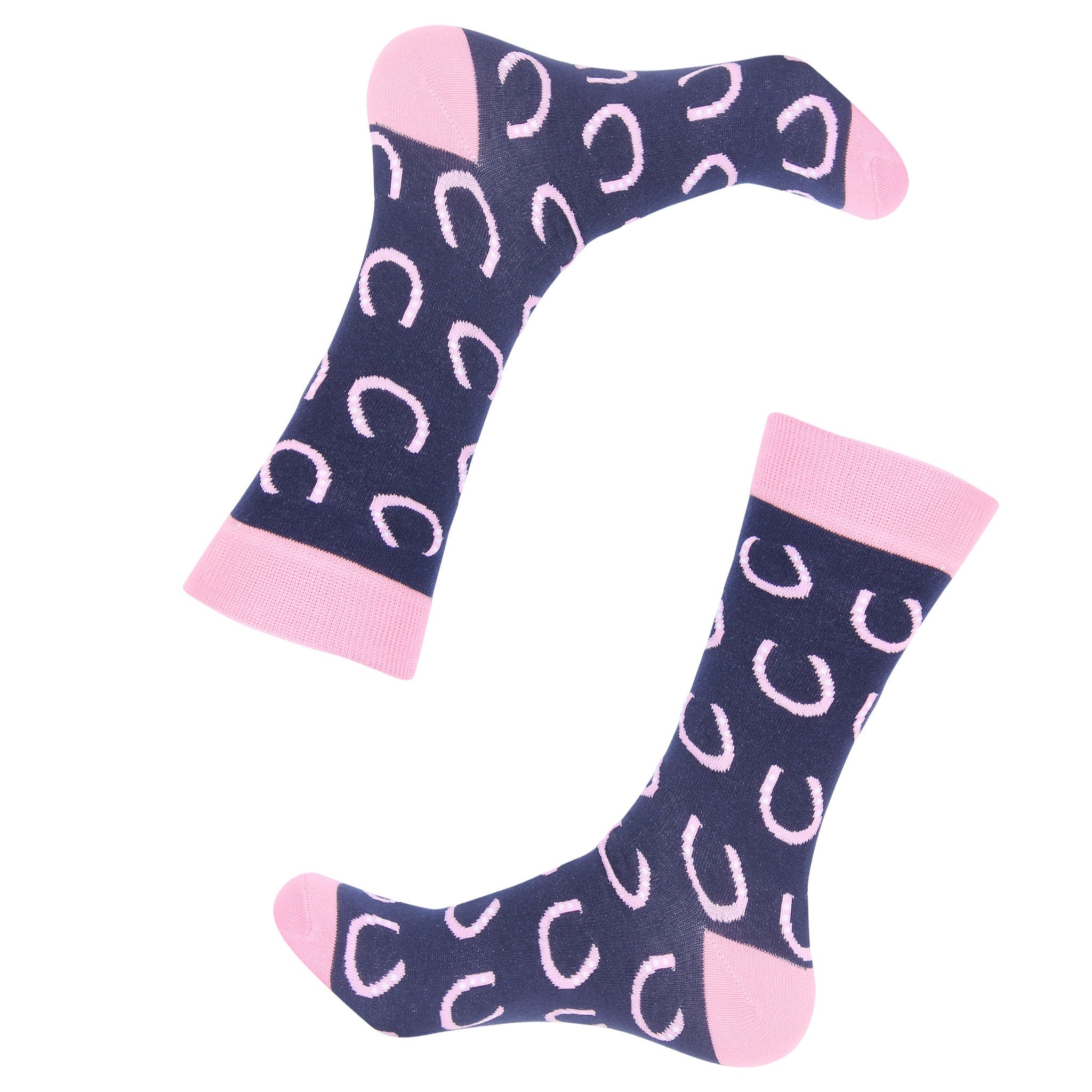 A stylish and spirited accessory that seamlessly marries equestrian charm with contemporary fashion. Meticulously crafted, these socks feature a dynamic design showcasing horseshoes against a sophisticated navy backdrop with a playful touch of pink, making them the perfect choice for those who appreciate the elegance of horse racing.