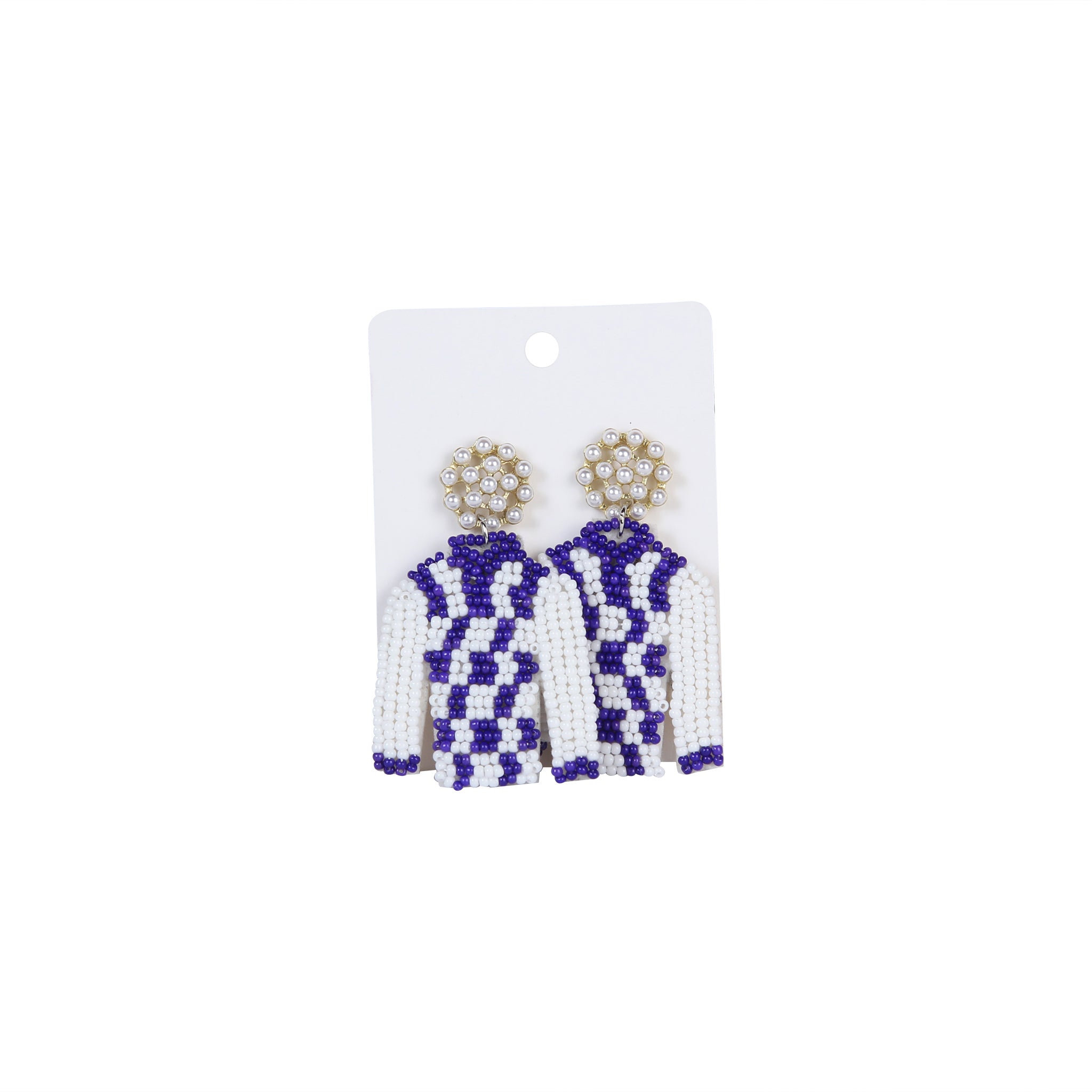 The classic combination of blue and white hues, accentuated by the intricate Jockey Silk pattern, makes these earrings a perfect accessory to complement your Derby Day attire. The use of party seed beads adds a touch of whimsy and charm, ensuring that these earrings stand out in any crowd.