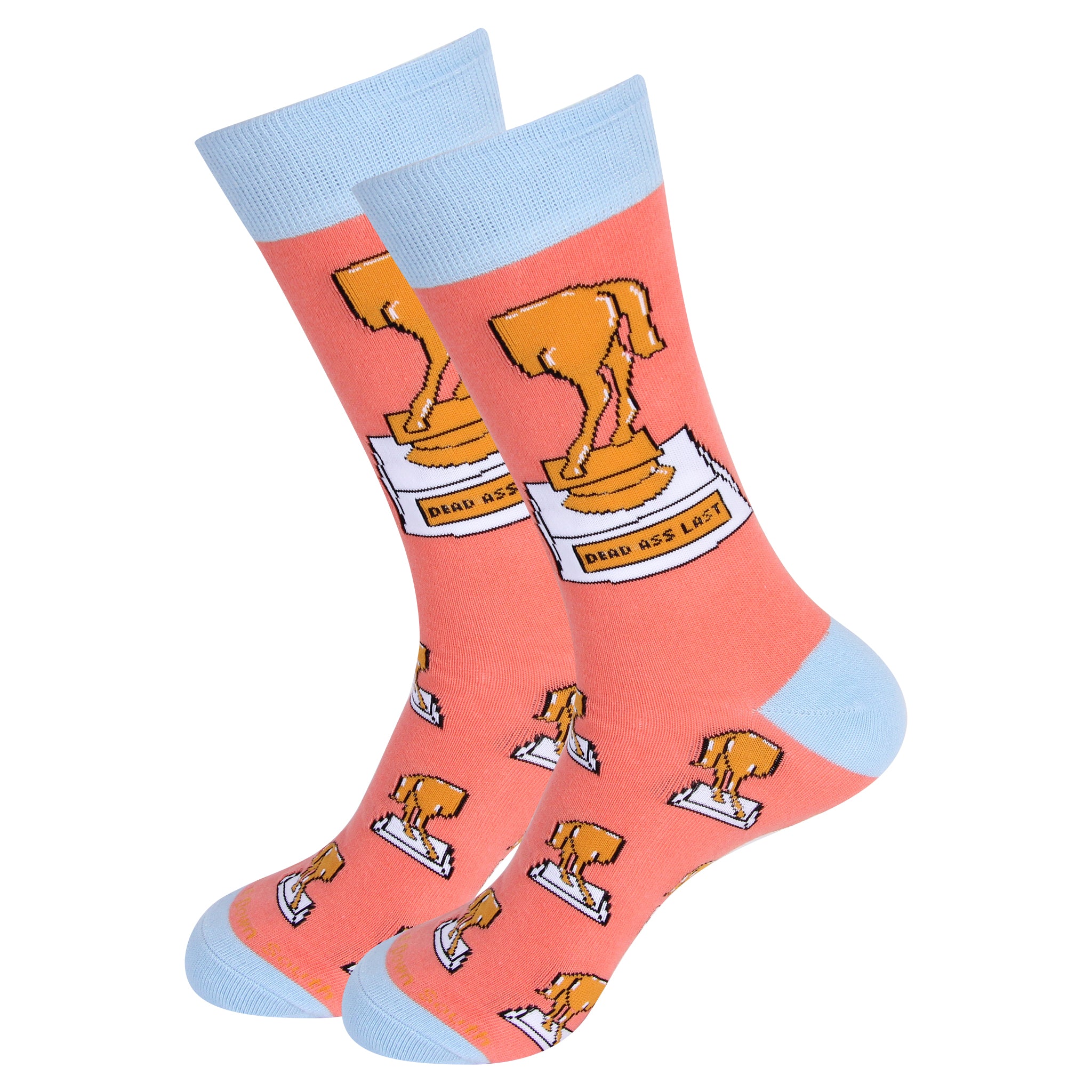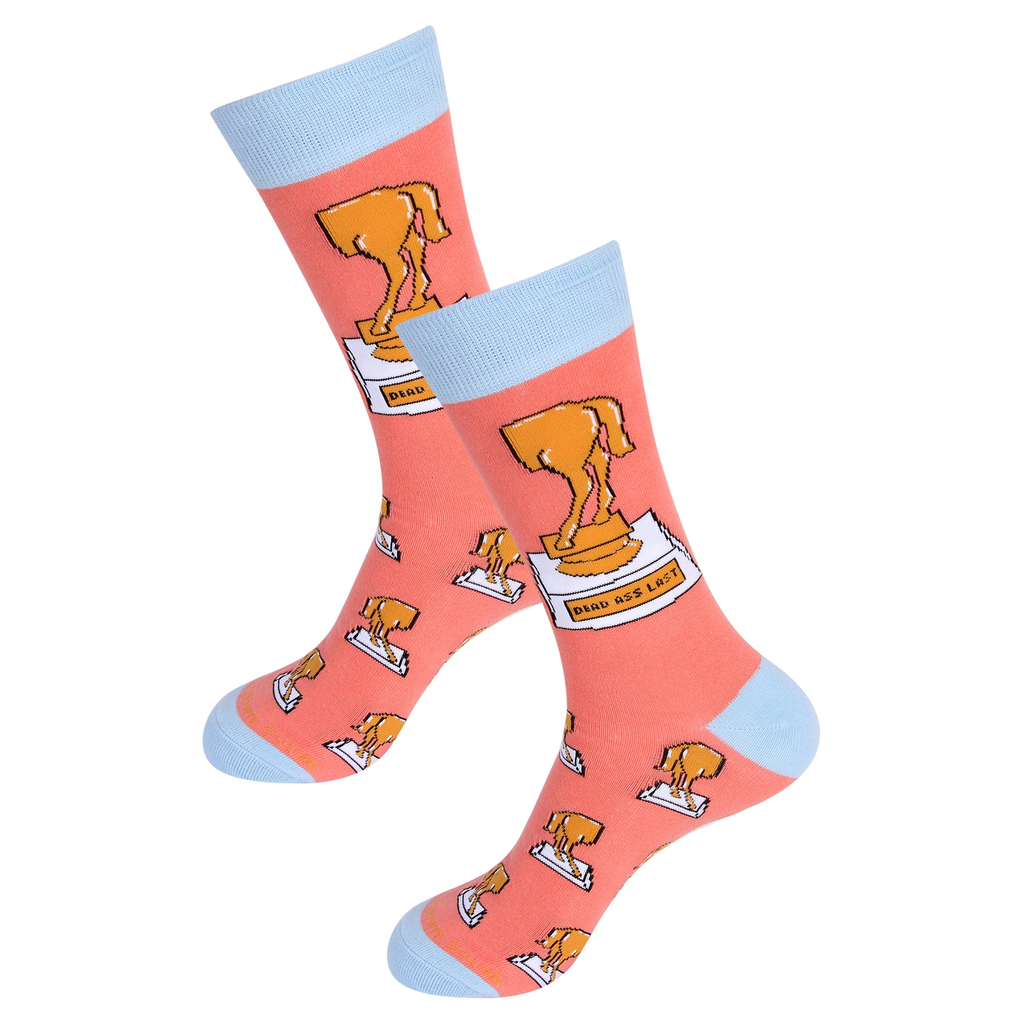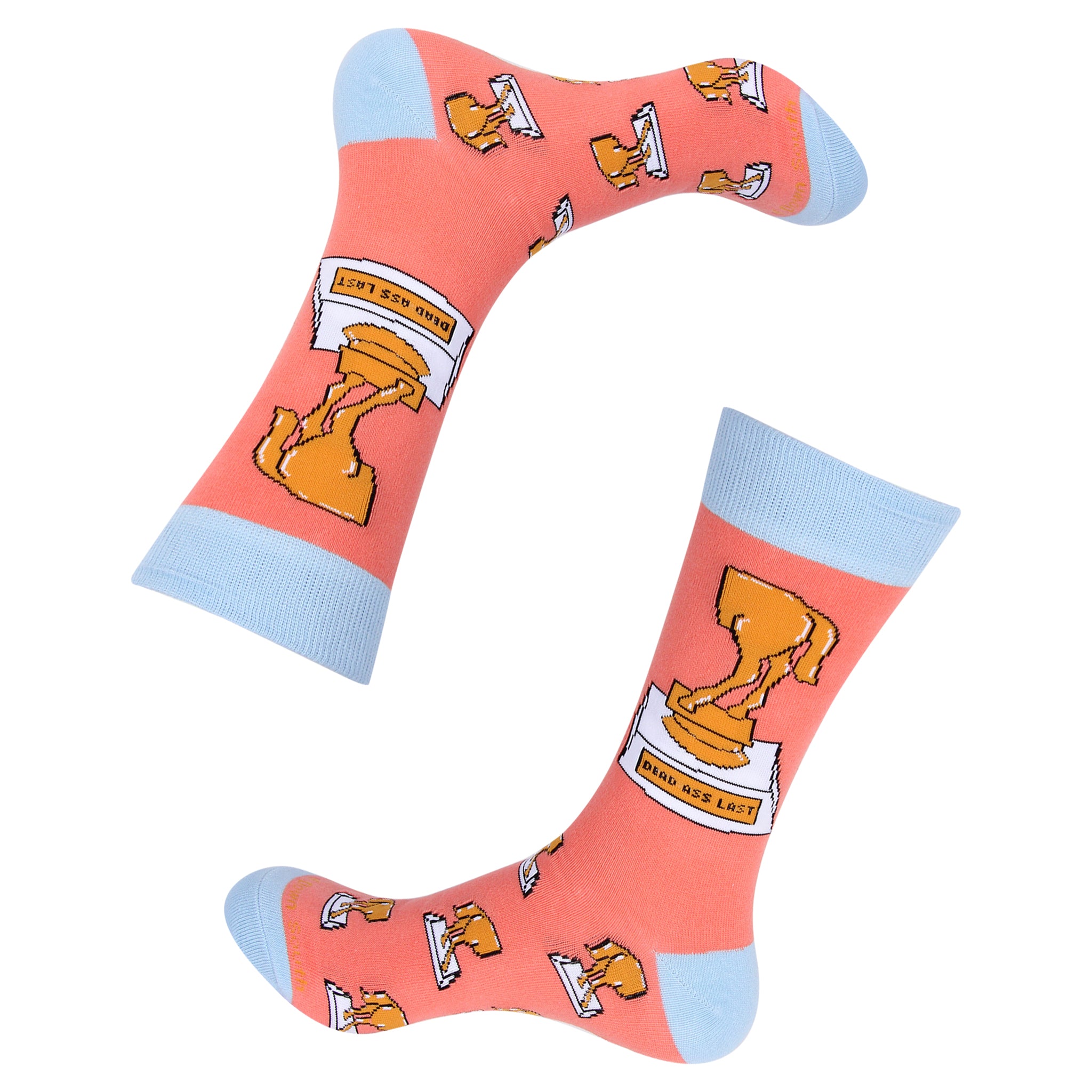 Celebrate the lighter side of the race with our cheeky Dead Ass Last Socks, featuring a repeating pattern of whimsical horse trophies humorously labeled “Dead Ass Last” against a vibrant coral background. These socks bring a fresh, playful twist to horse racing apparel, perfect for fans who appreciate a little self-deprecating humor and bold, colorful style.