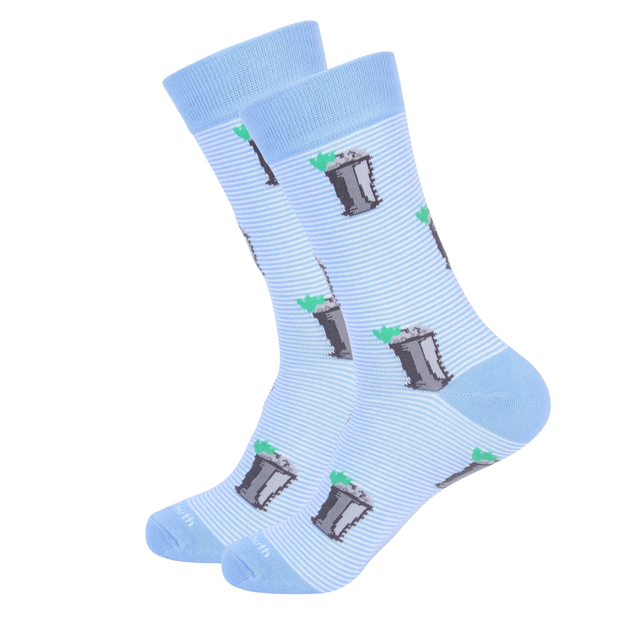 Sip in style with our Light Blue Striped Mint Julep Socks, featuring the classic mint julep cocktail against a crisp light blue background. Perfect for Kentucky Derby fans, bourbon enthusiasts, and anyone who loves the Southern elegance of Derby Day celebrations, these socks bring the iconic mint julep right to your feet.