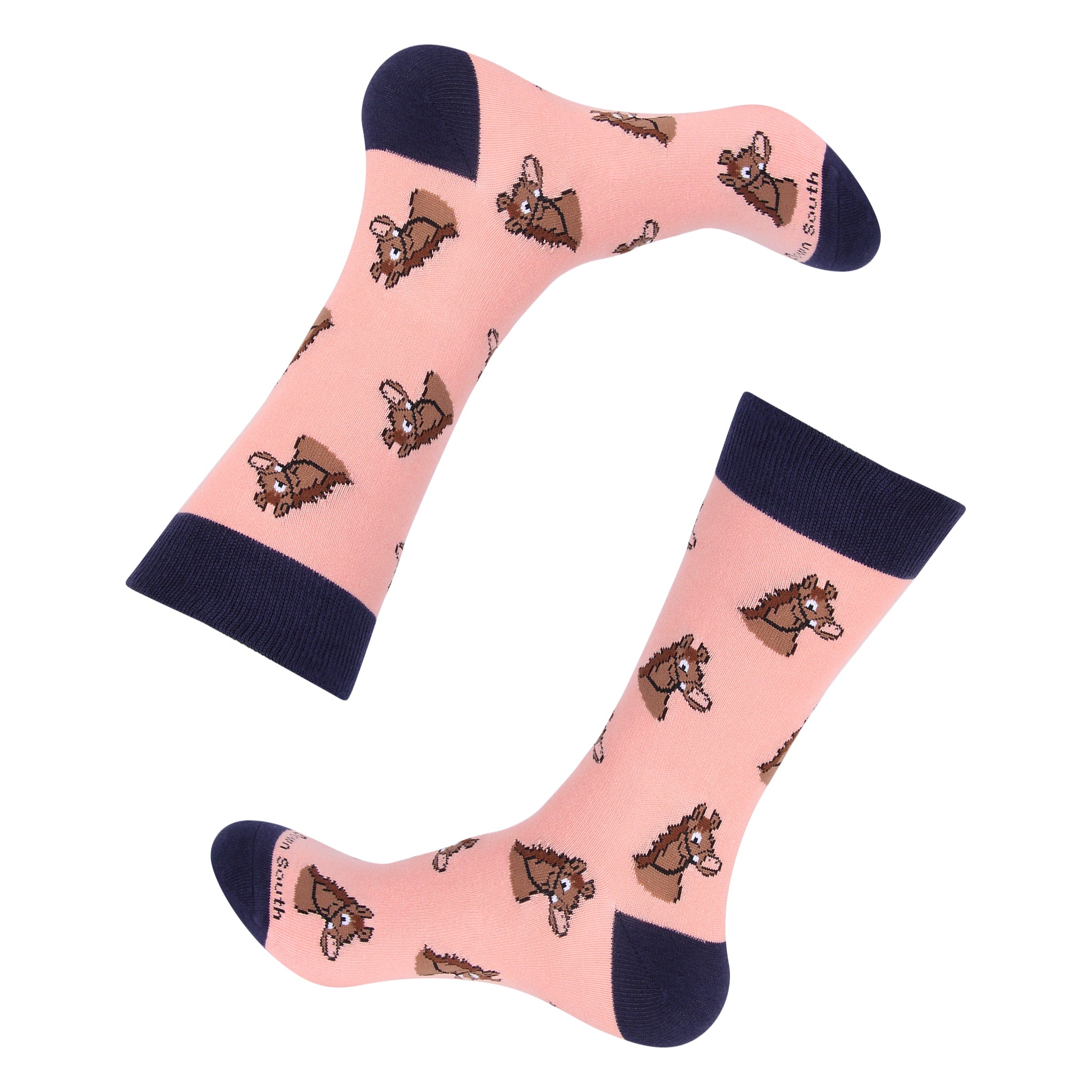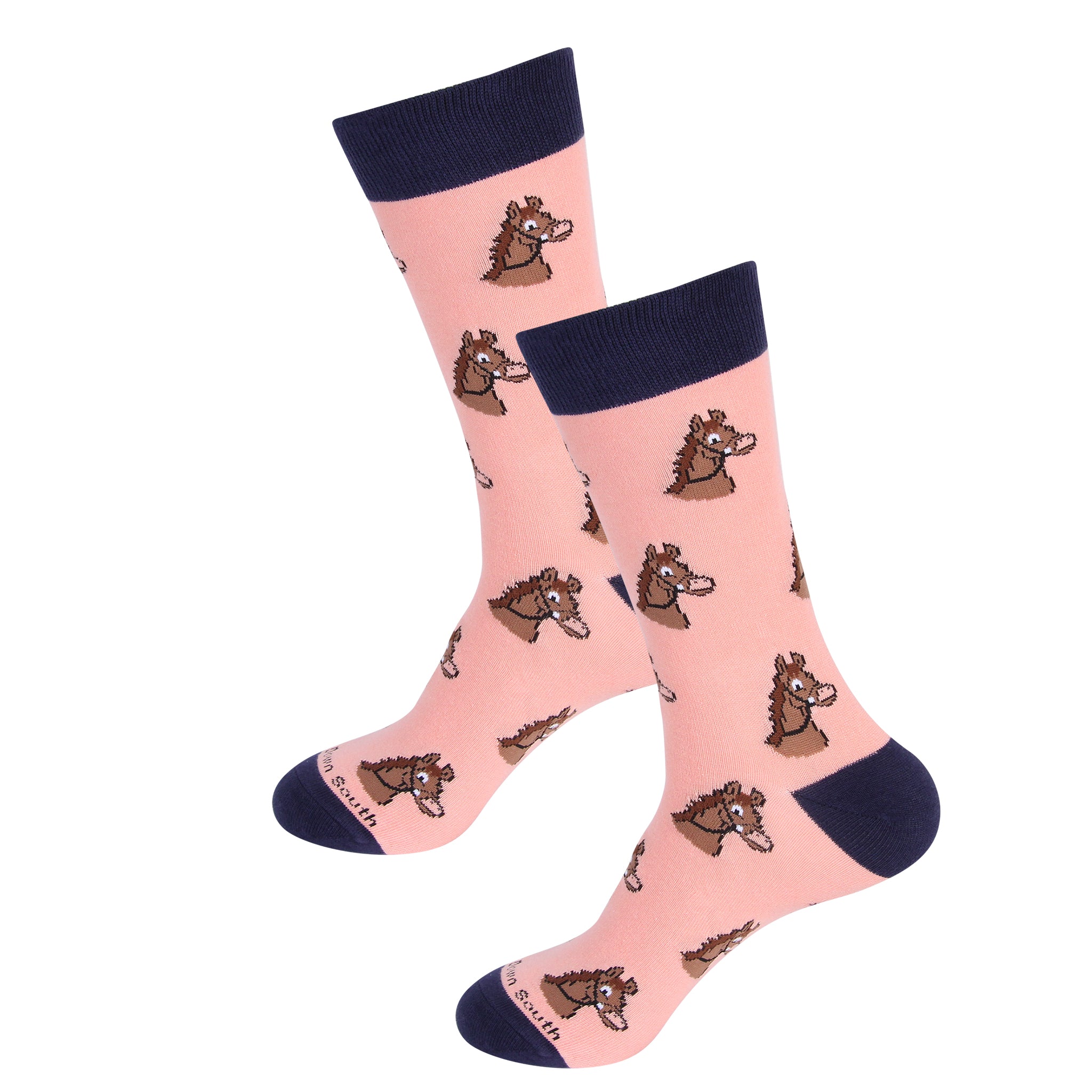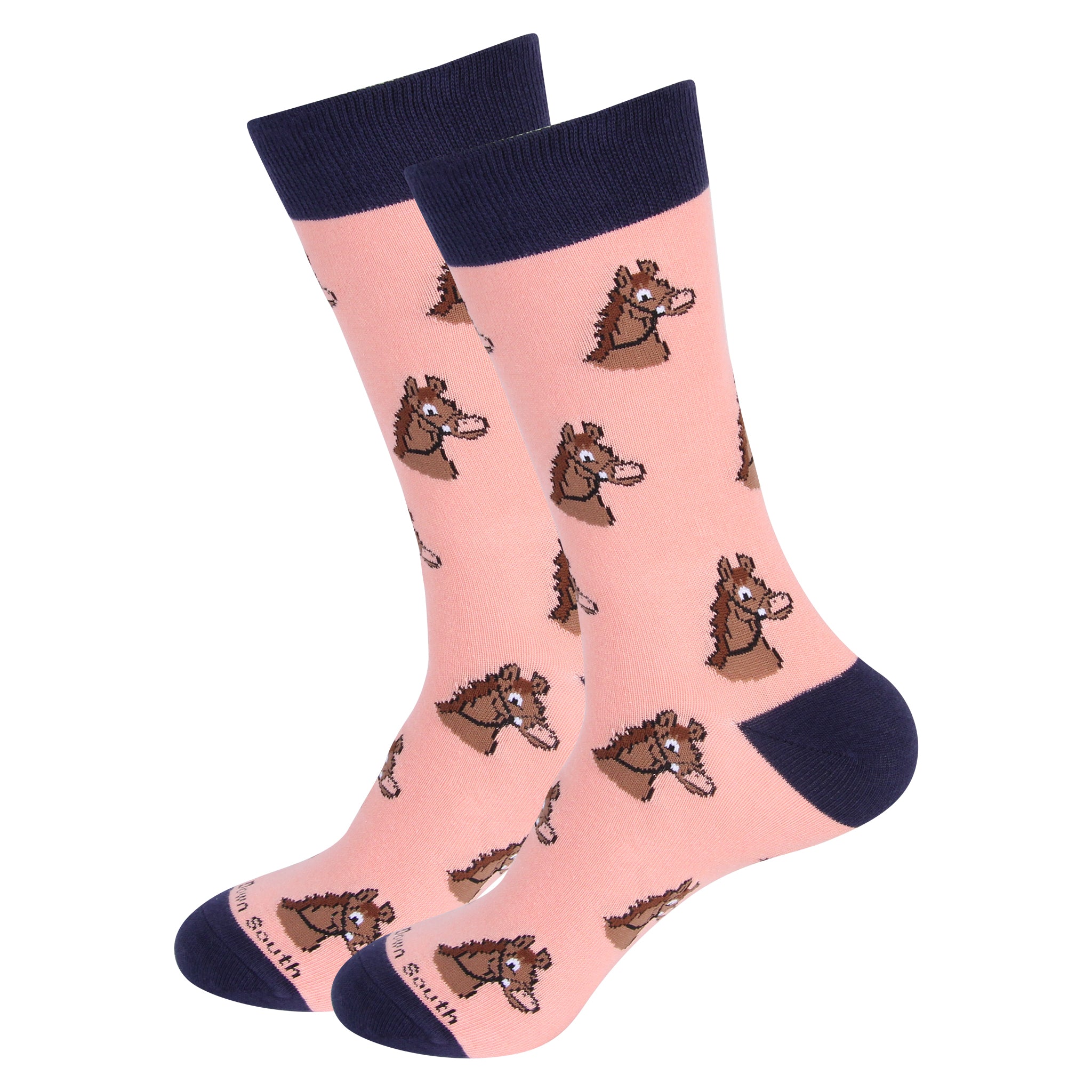 Whether you’re heading to the stables, cheering at the races, or simply want to celebrate your love for horses with a subtle yet striking design, these socks offer a blend of classic equestrian charm and modern color appeal. The soft peach backdrop complements the intricate horse head motifs, making these socks a standout choice for everyday wear or special occasions.