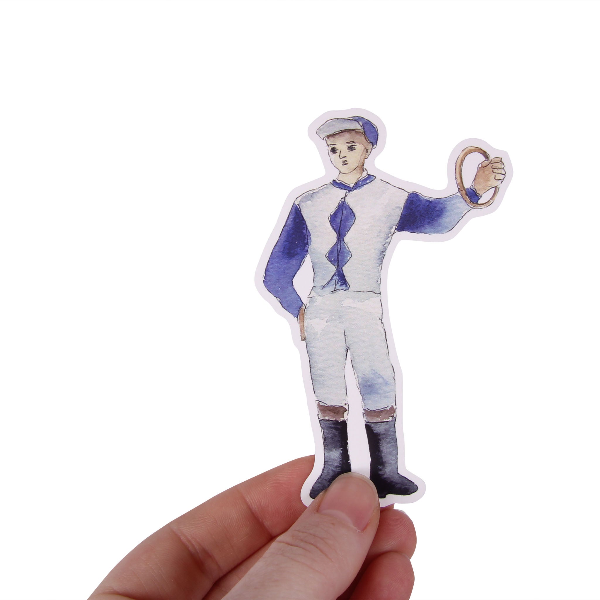 Perfect for horse racing fans and equestrian enthusiasts, this Standing Jockey Sticker features a classic silhouette in striking blue and white silks. Whether you're decorating a laptop, water bottle, or barn door, this vibrant design captures the spirit of the track. Durable and weather-resistant, it's ready to stick with your passion for all things racing.
