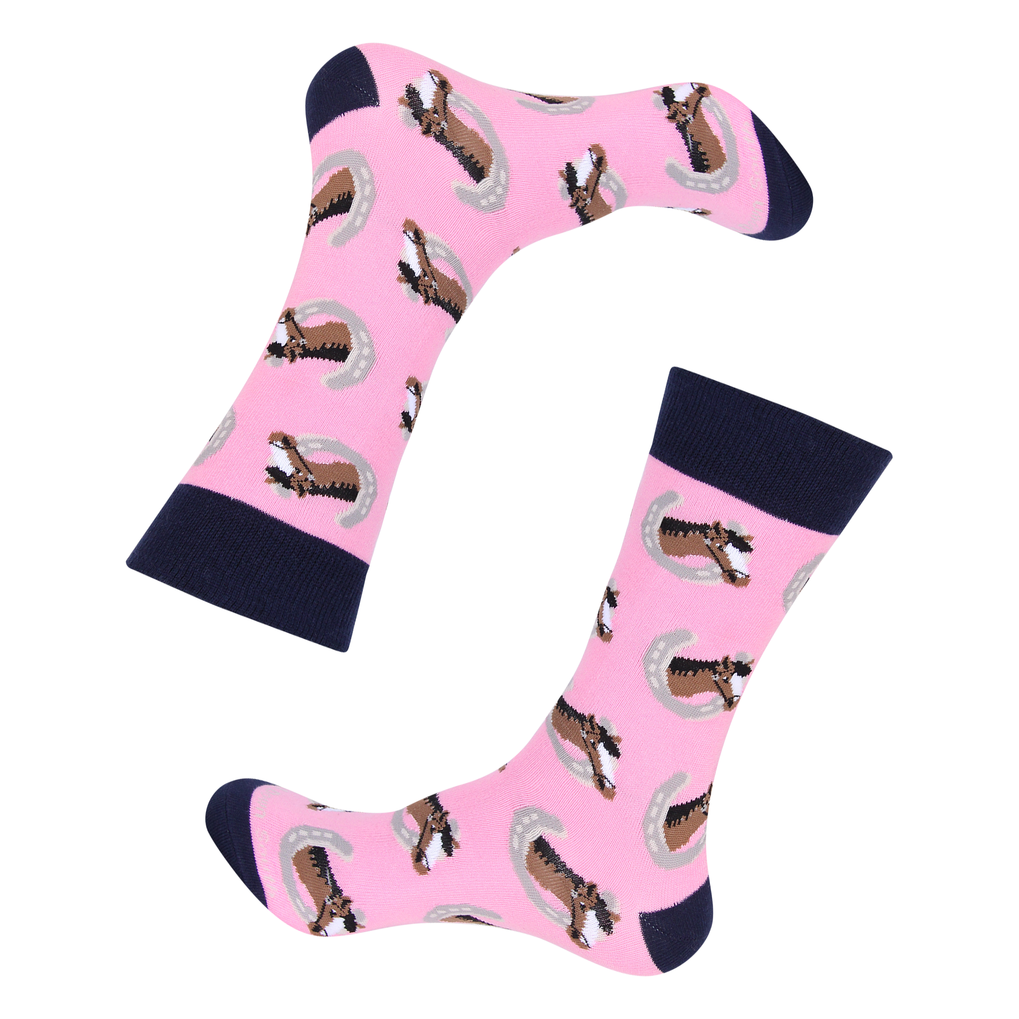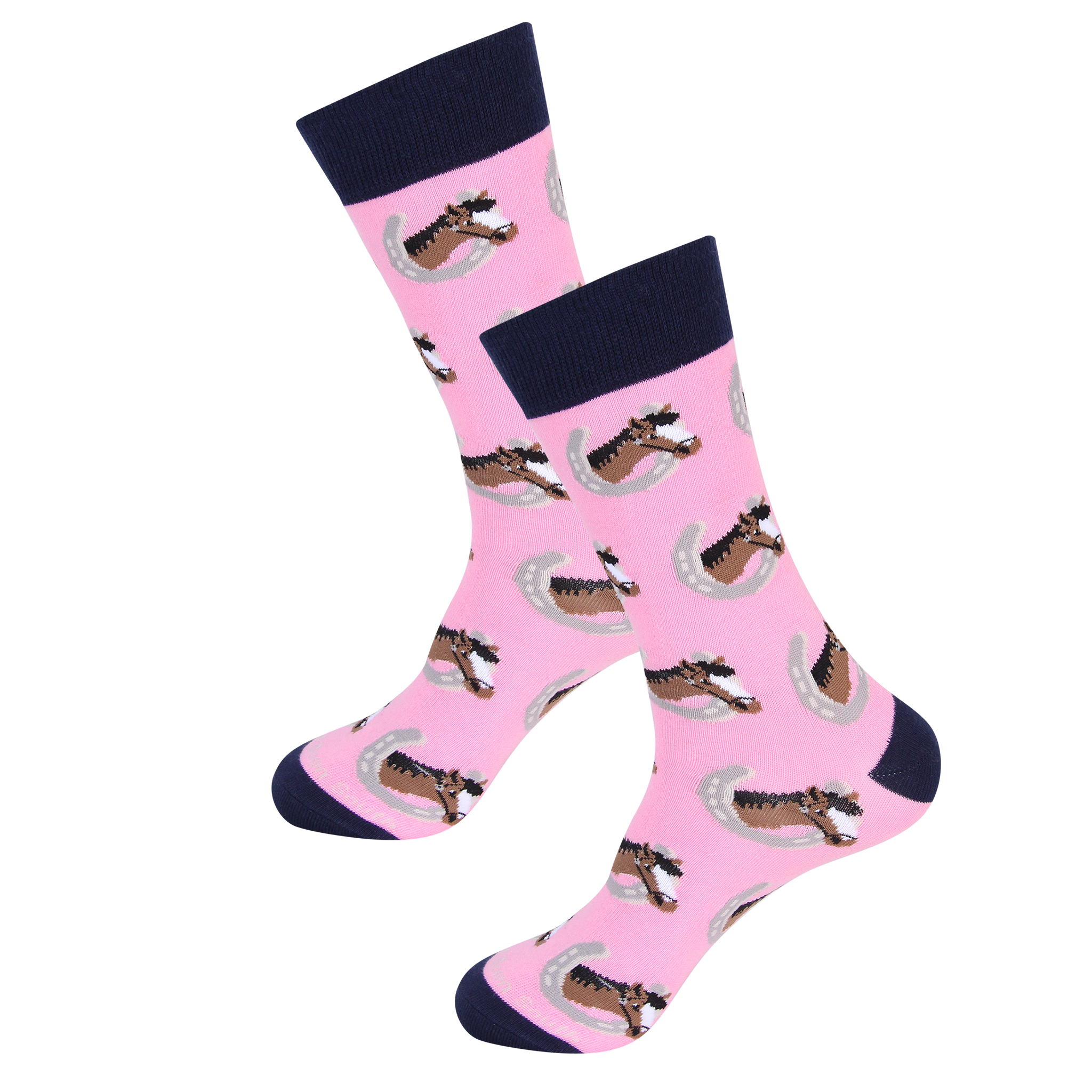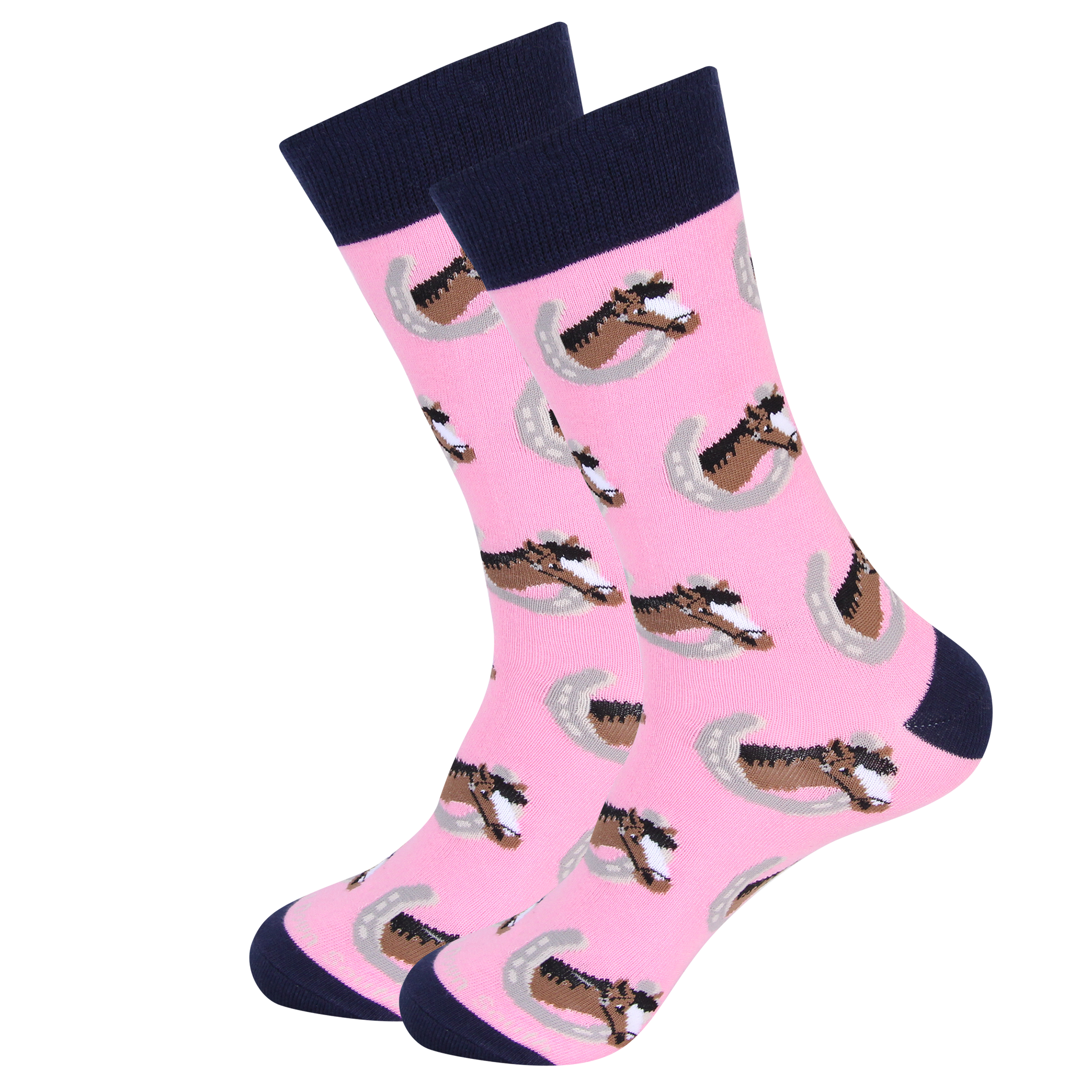 Step into playful elegance with the Horse Head in Horseshoe Socks, featuring a charming repeating pattern of horse heads framed by classic horseshoes against a vibrant pink background. These socks are perfect for equestrian enthusiasts who want to add a fun and feminine touch to their everyday style.