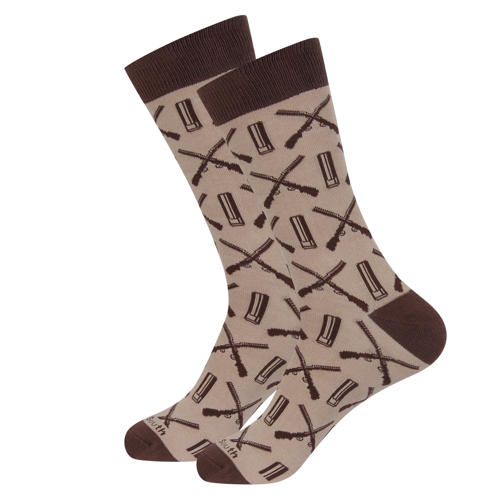 Show off your outdoor spirit with our Tan Hunting Socks. Featuring an all-over pattern of crossed rifles and shells on a tan background with deep brown accents, these socks are designed for hunters and outdoorsmen who like to carry their passion everywhere. Made from a cotton, polyester, and spandex blend, they’re breathable, stretchy, and built for all-day comfort. With a unisex fit and bold hunting-inspired design, they’re perfect for weekends at the cabin, hunting trips, or everyday wear.
