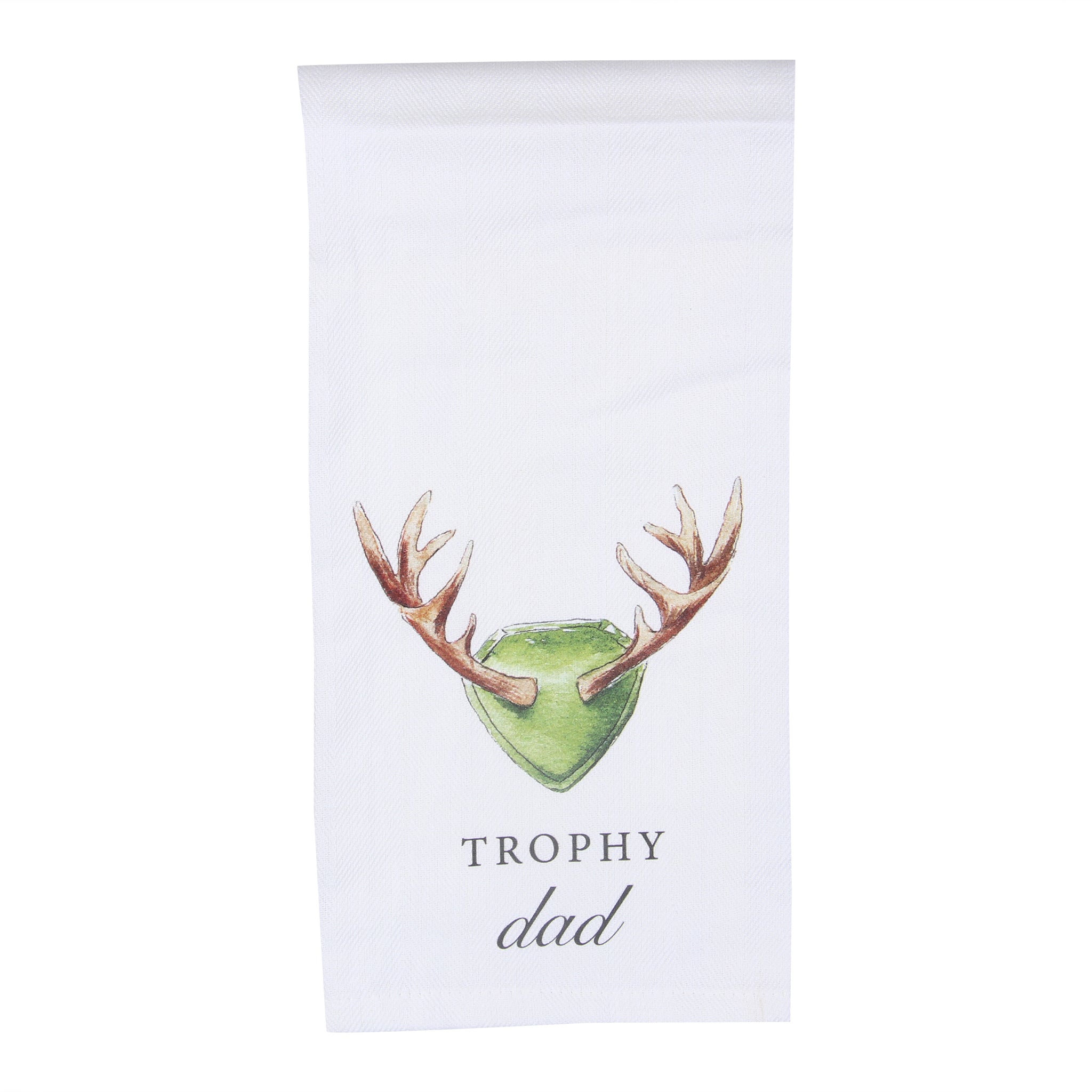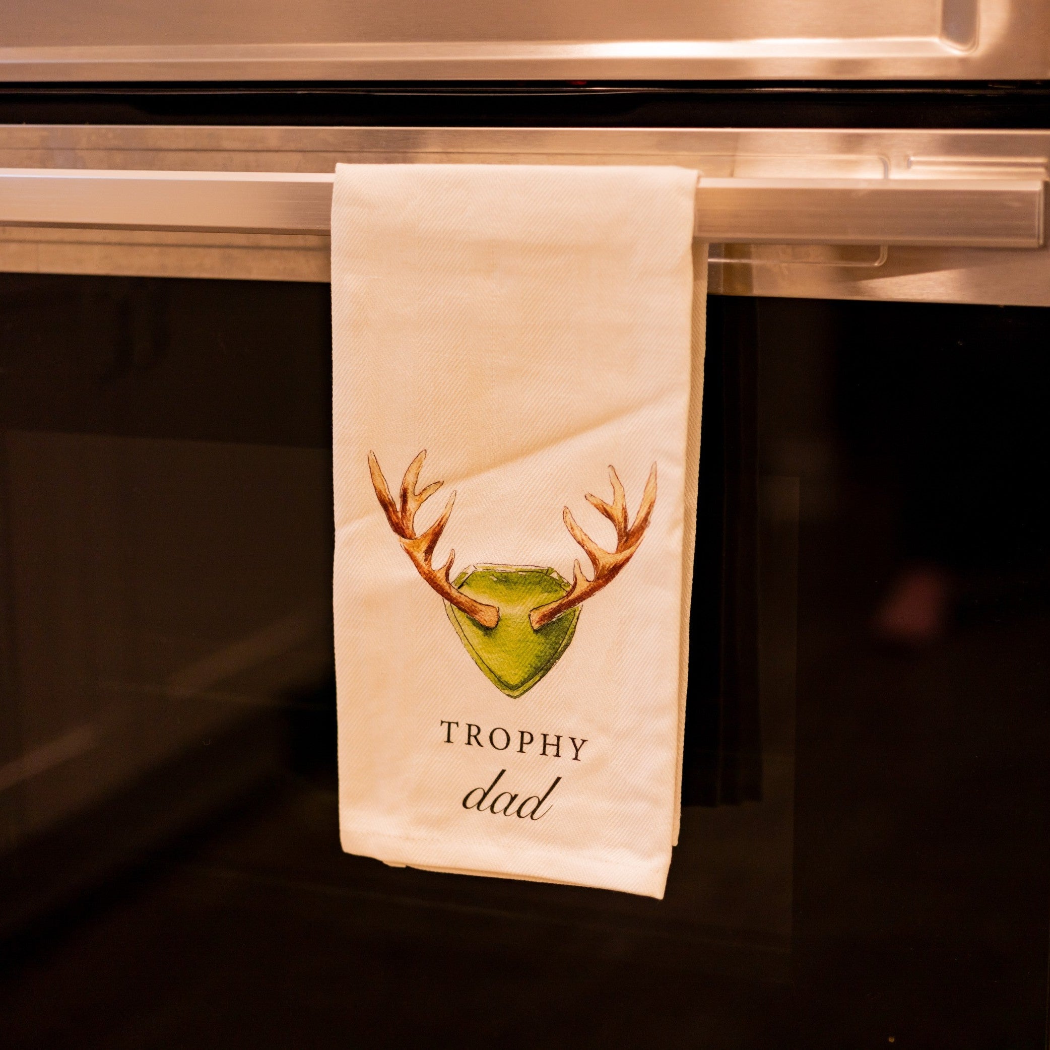 Our Trophy Dad Tea Towel features a classic watercolor-style antler crest with a timeless, outdoors-inspired design that feels right at home in the kitchen, cabin, or lake house. Equal parts charming and playful, it’s the perfect everyday nod to hunting season, dad jokes, and the guy who proudly holds the title of “trophy dad.”
