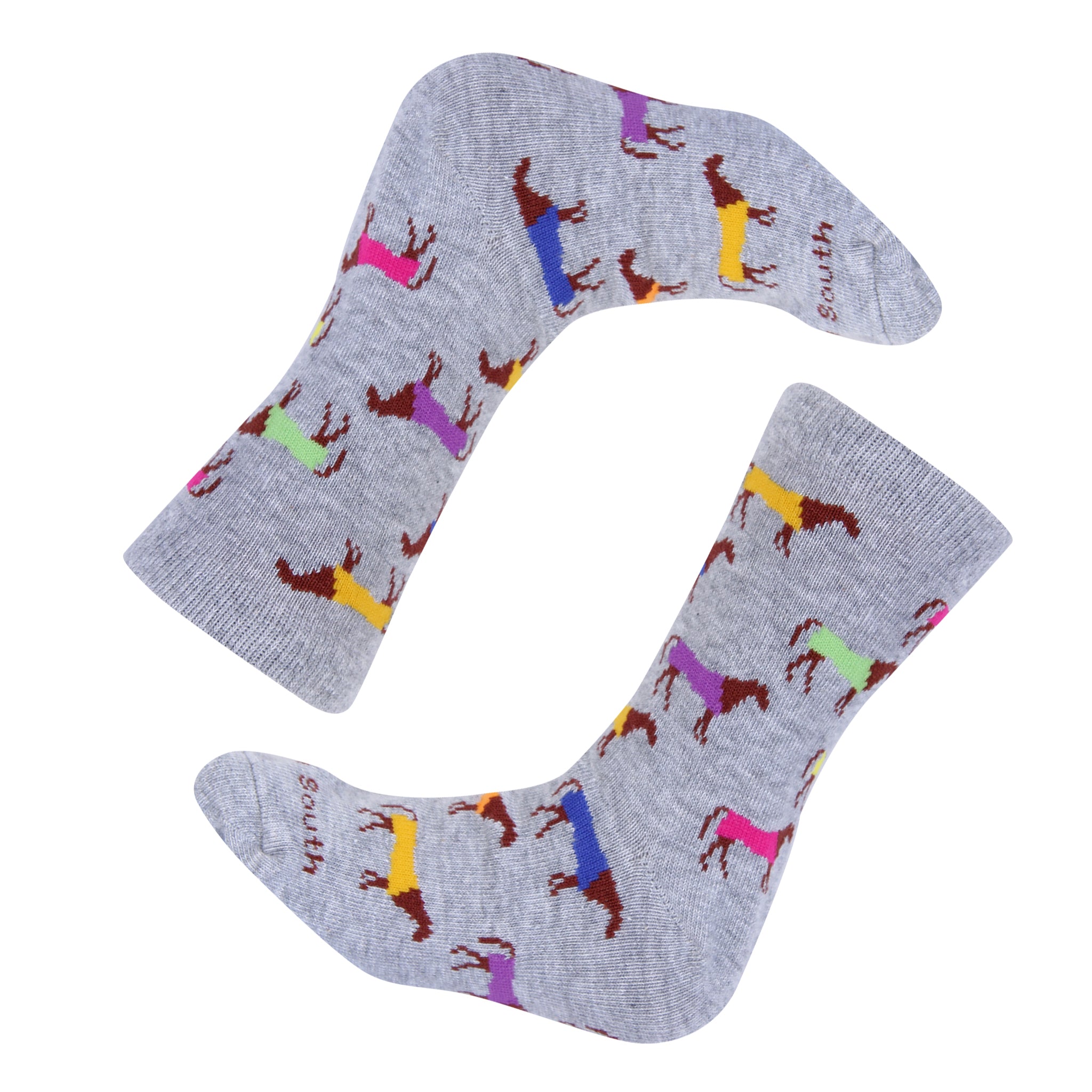 Brighten up your little one’s day with our Kids Multi Color Horse Socks, featuring a playful repeating pattern of vibrant, multi-colored horses against a soft grey background. Perfect for young horse lovers and adventurous kids who love bold, fun designs, these socks add a splash of color and whimsy to any outfit.