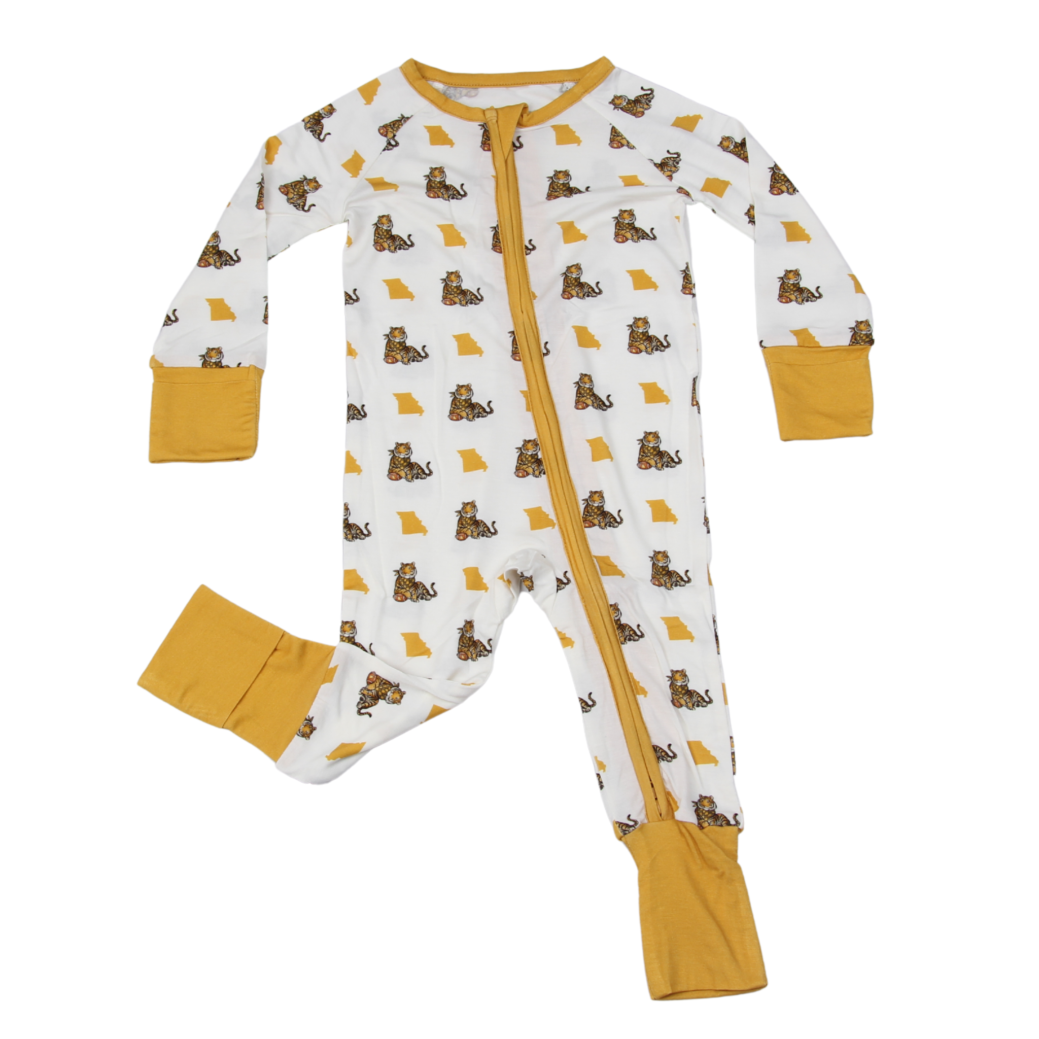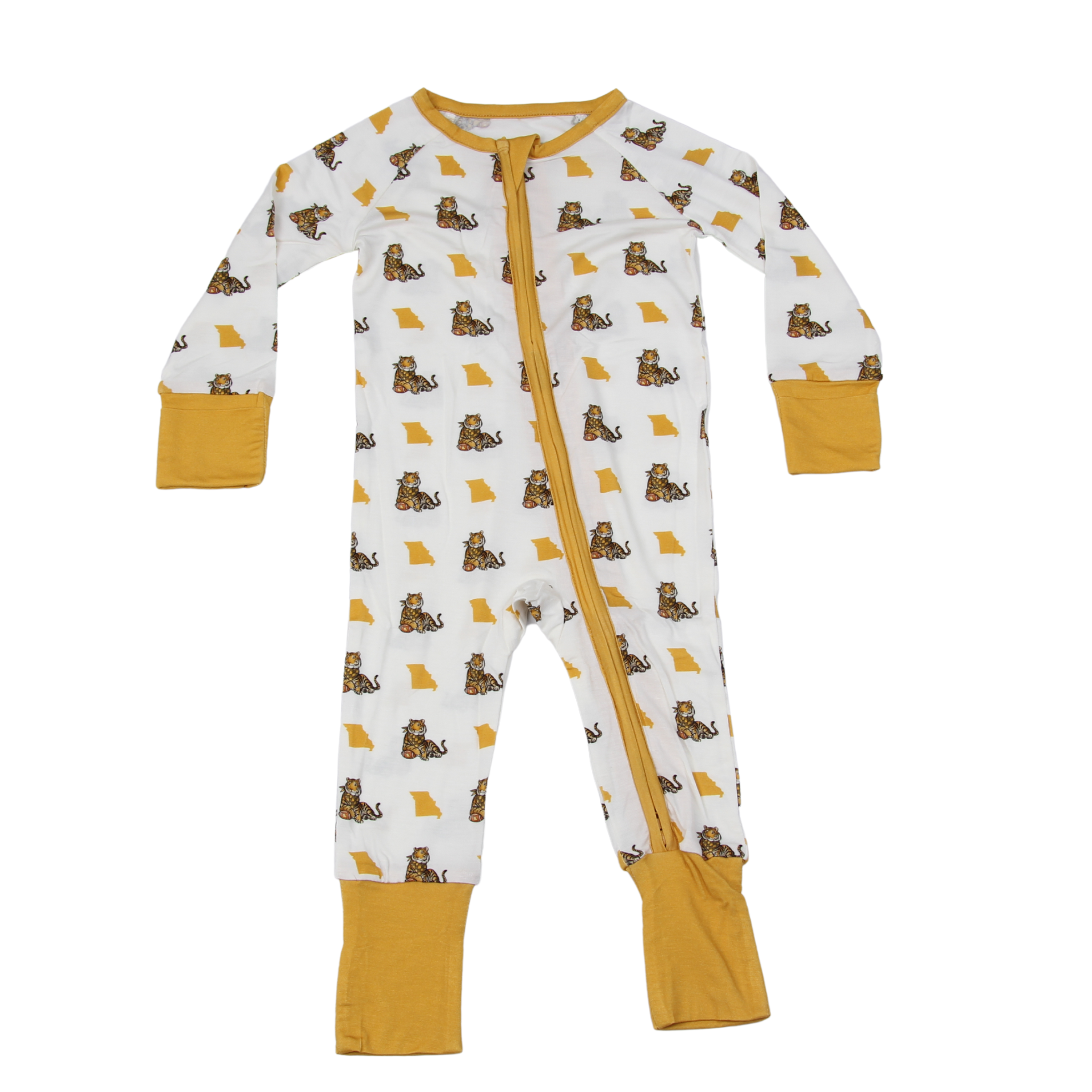 Let your little one drift off to sleep in style with our Missouri Shape Tiger Unisex Kids Pajamas, designed for kids who dream big and roar even louder! Featuring a playful repeating pattern of bright yellow Missouri state outlines and bold tigers, these PJs are perfect for showing off a little state spirit with a wild twist.