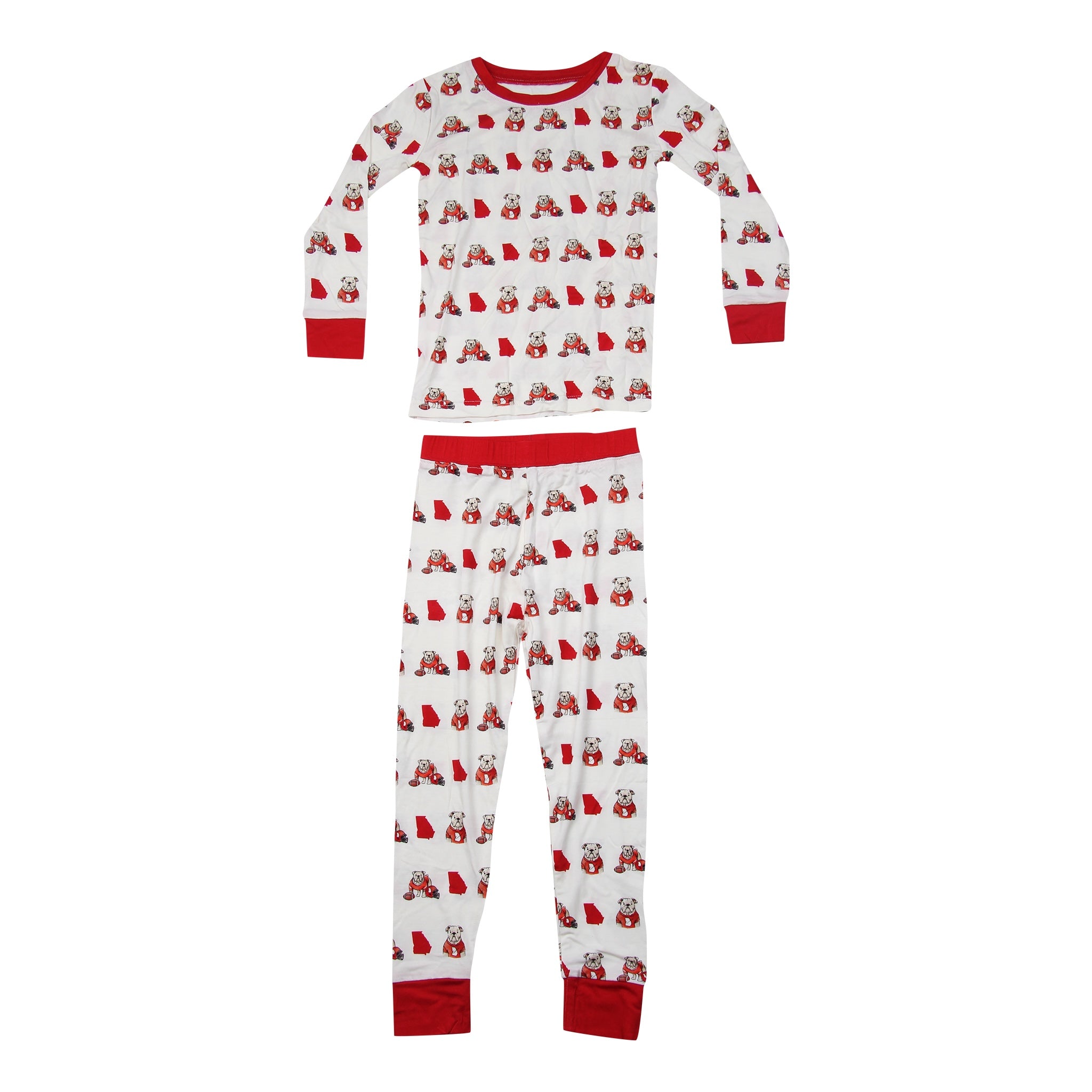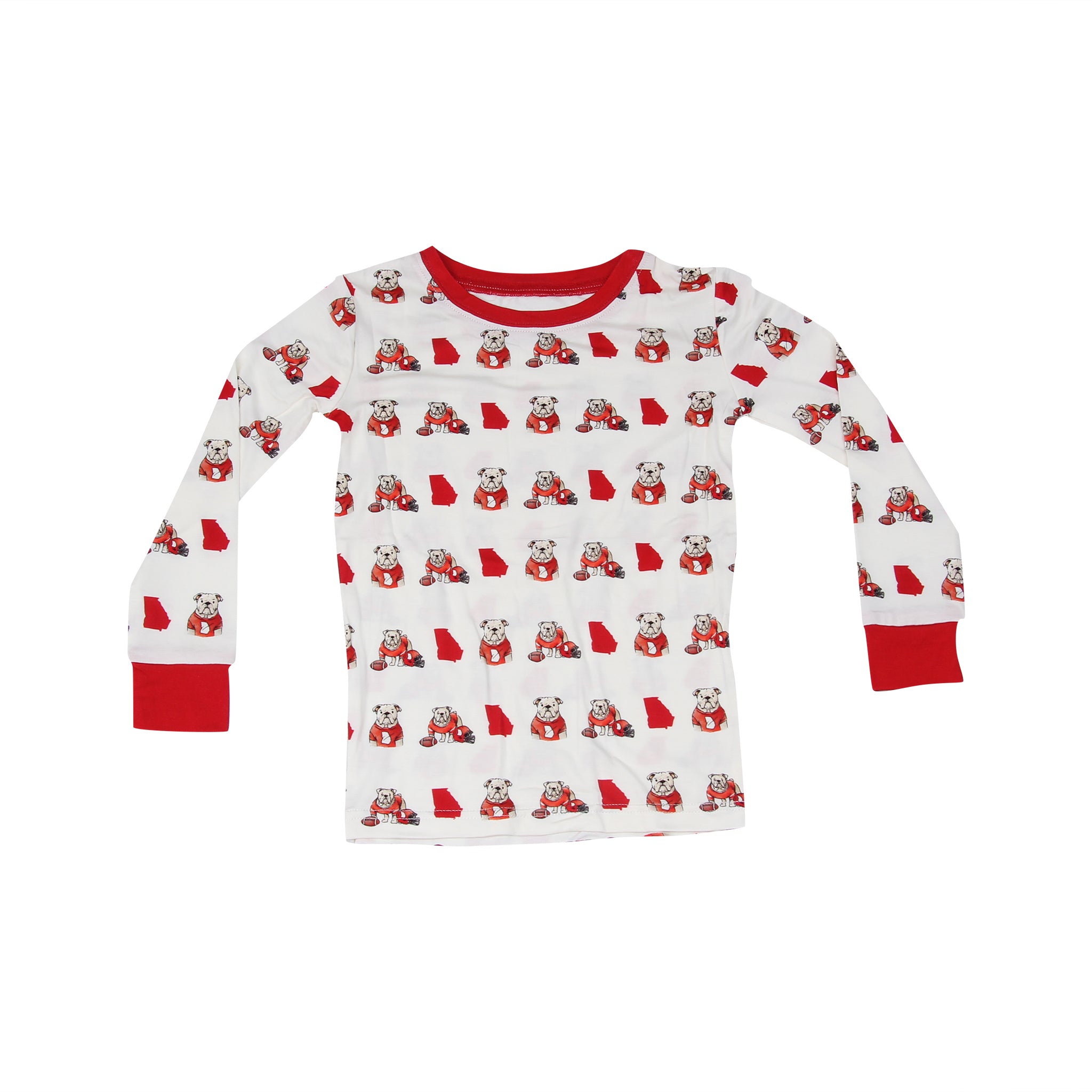Show off that Georgia spirit—even at bedtime! Our Georgia State Shape Unisex Kids Pajamas feature a fun and bold repeating pattern of bright red Georgia state outlines and tough-but-cute bulldogs, perfect for little fans of the Peach State and its most iconic mascot.
