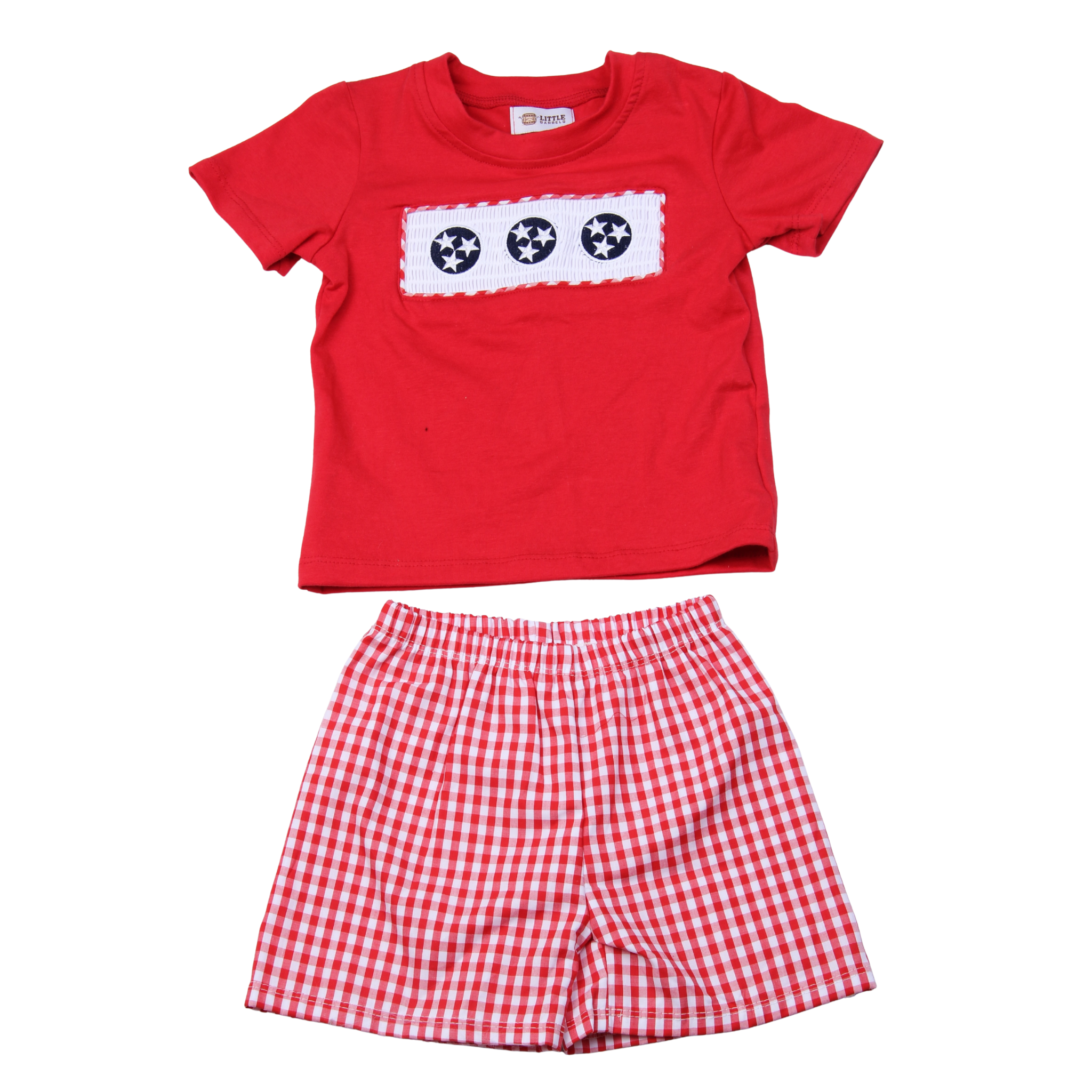 Dress your little one in Tennessee pride with this Red Tri Star Boys Set! Featuring classic red and white gingham shorts paired with a vibrant red shirt adorned with three tri-star emblems across the front, it's the perfect outfit for celebrating the Volunteer State. Comfortable and spirited, this set captures that down-home Southern style kids will love wearing to family gatherings, casual outings, or any occasion calling for a touch of regional flair.
