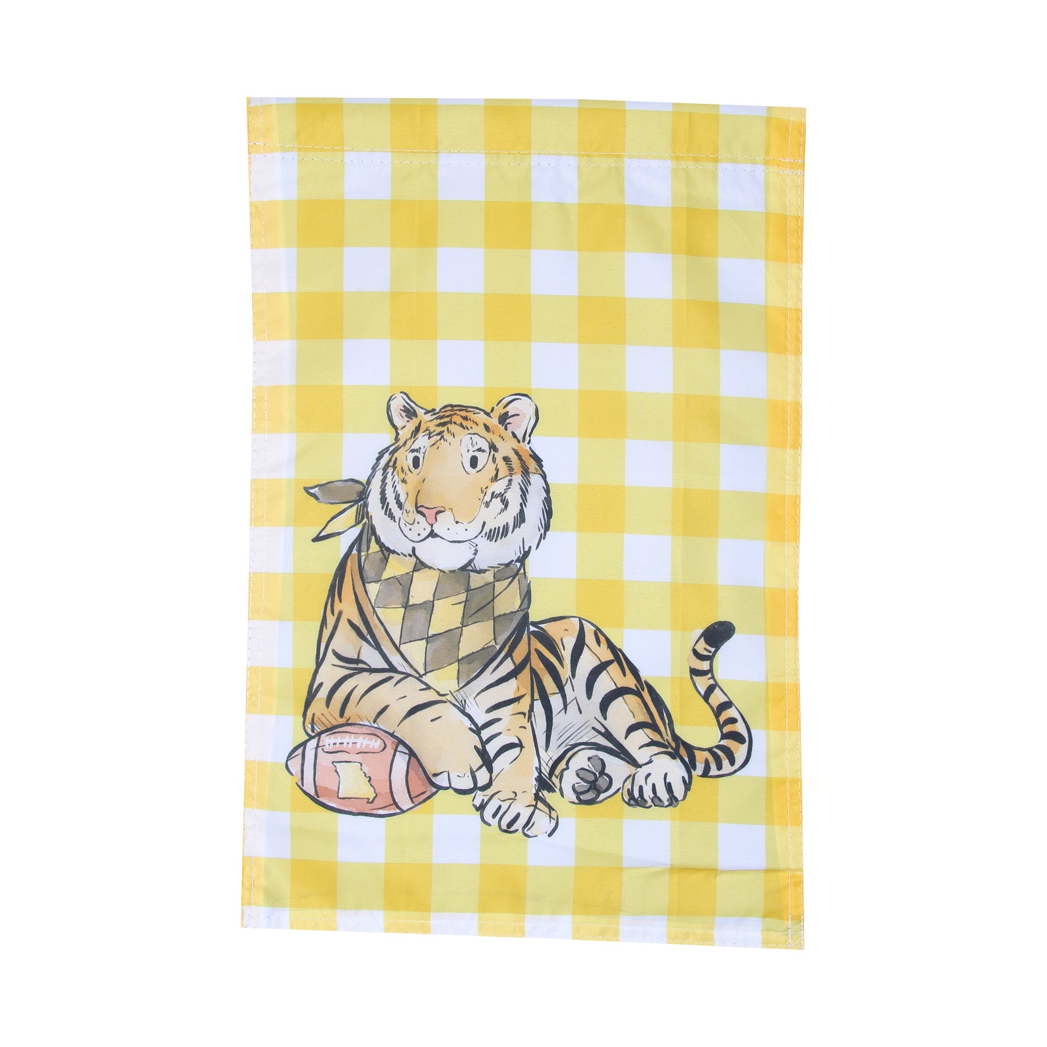 Bring bold personality to your outdoor décor with this Yellow Plaid Tiger MO Garden Flag. Featuring a playful tiger lounging with a football and wearing a patterned scarf, the design pops against a cheerful yellow-and-white checkered background. Perfect for porches, yards, and tailgates, this flag combines durability with lively game day energy.
