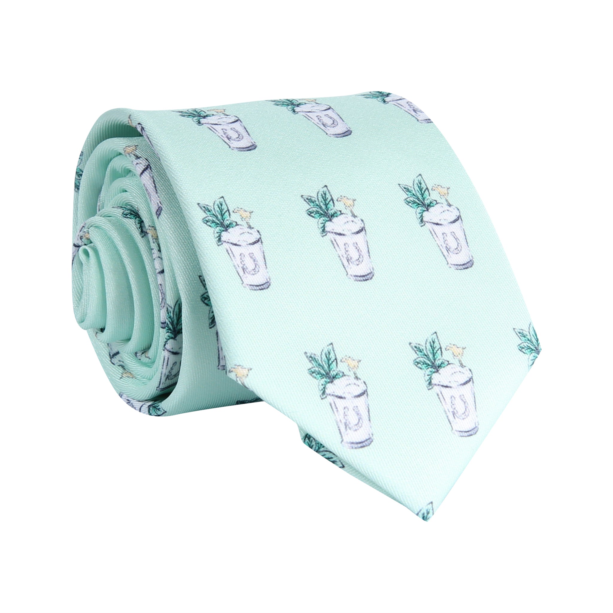 Add a touch of elegance to your outfit with our Light Green Mint Julep Necktie, featuring a charming mint julep icon in a step and repeat pattern. Perfect for the horse races, this necktie will surely make you stand out from the crowd. Elevate your style and embody sophistication with this must-have accessory.