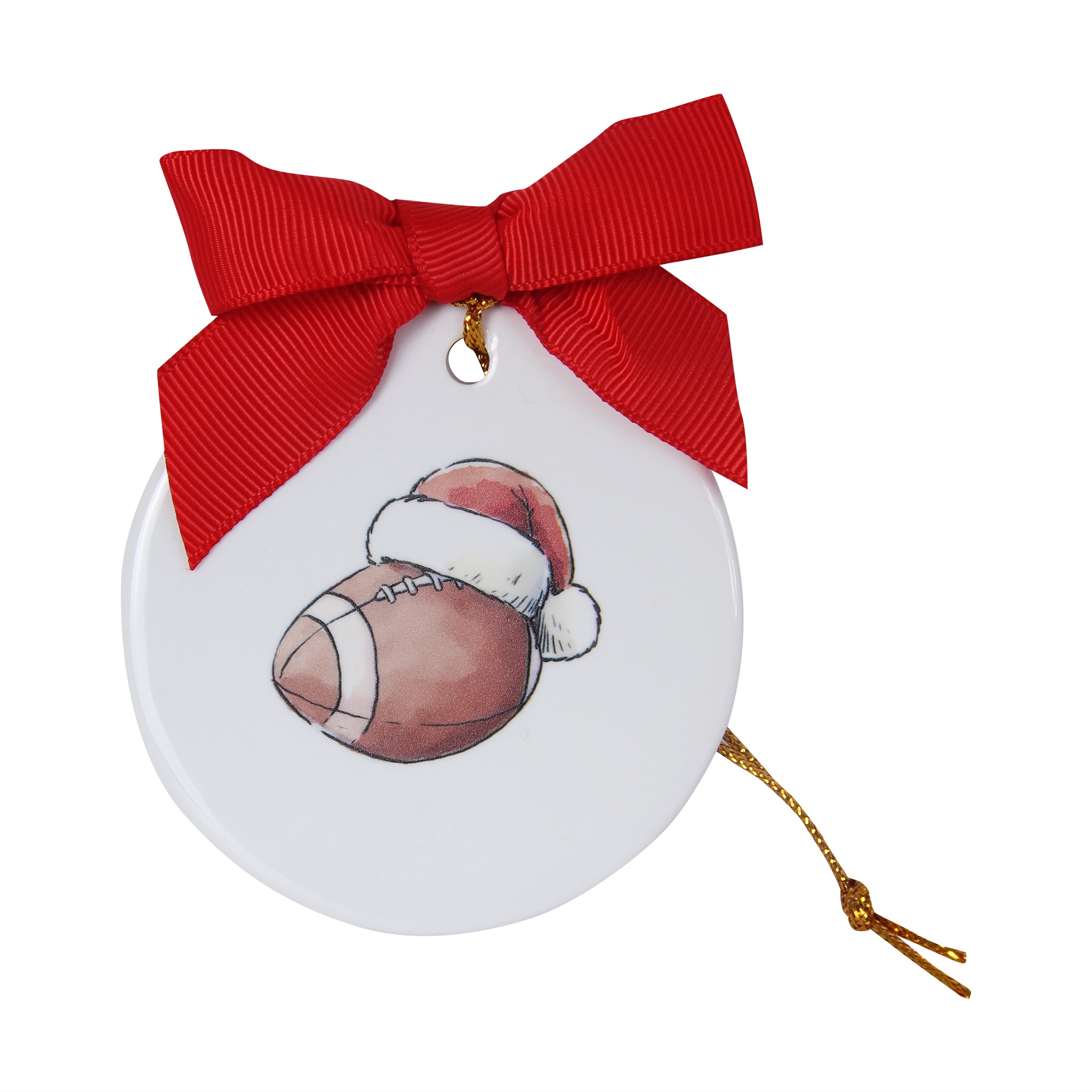 Celebrate the holiday season with this playful ceramic ornament showcasing a football decked out in a cheerful Santa hat. Topped with a bright red bow, it adds a festive touch to any tree, perfect for sports fans who love a bit of holiday spirit.