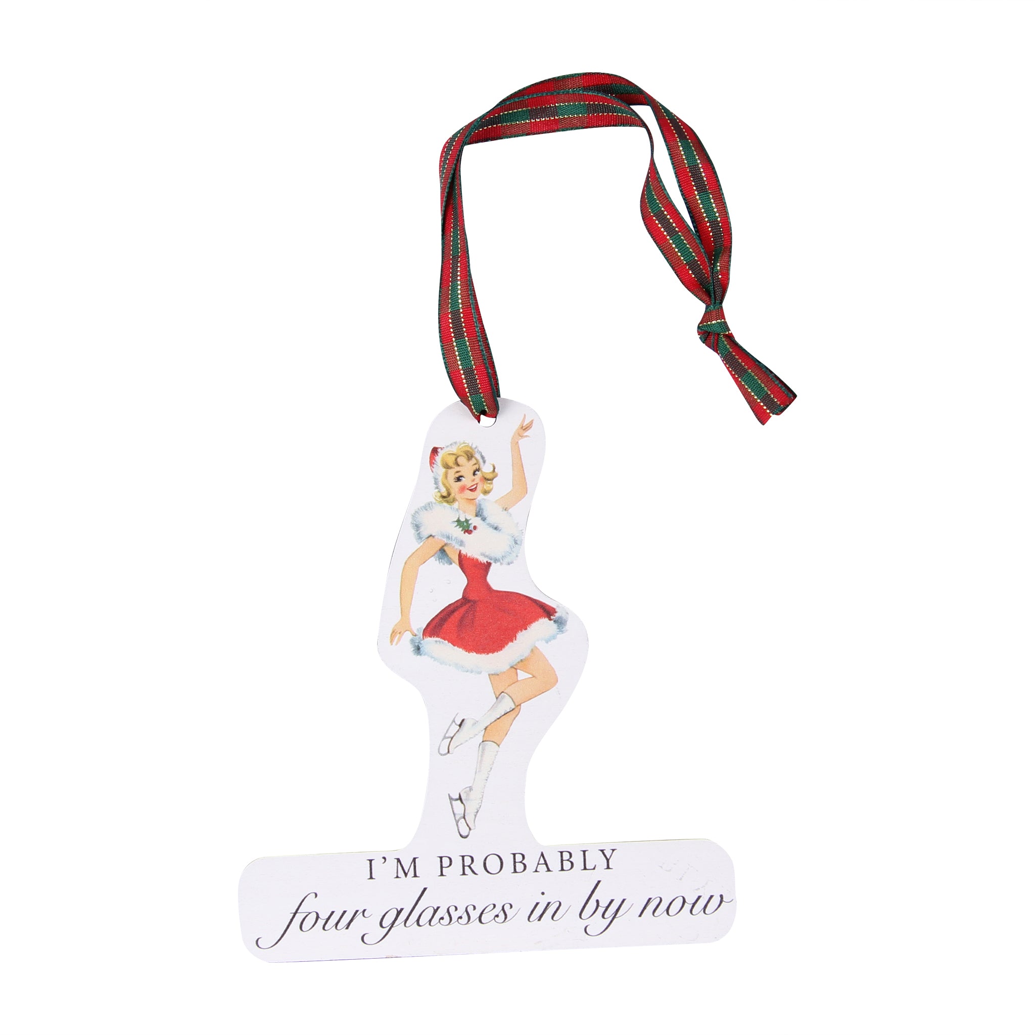 Bring a splash of holiday humor to your tree with this Four Glasses In Ornament. Featuring a lively illustration of a woman dancing in a festive red and white dress, alongside text reading "I'm probably four glasses in by now", this ornament is perfect for wine lovers, party hosts, and anyone who celebrates the season with a little extra cheer.