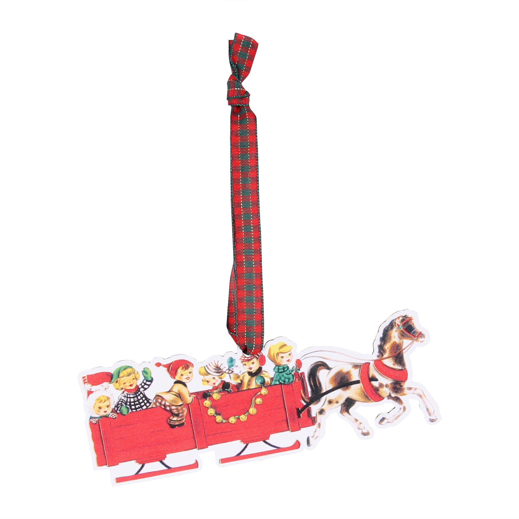Printed with bright, detailed artwork, this horse-drawn carriage ornament is perfect for adding a touch of nostalgia to your Christmas tree decorations. The timeless scene celebrates tradition, joy, and togetherness—making it a favorite for families and collectors of vintage Christmas ornaments.