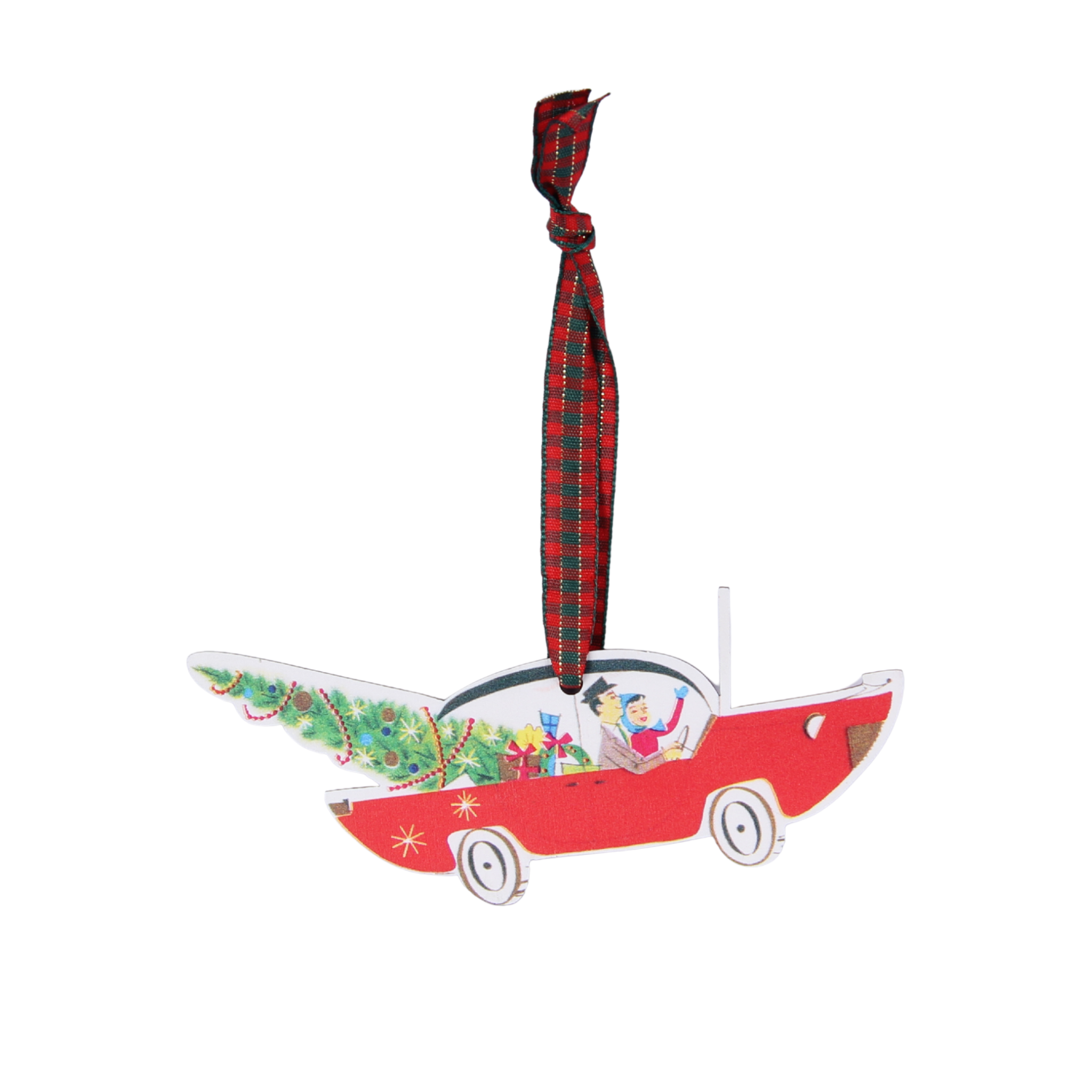 Celebrate classic holiday traditions with this charming Retro Car With Tree Ornament. Featuring a nostalgic illustration of a man and woman driving a retro car with a freshly cut Christmas tree tied to the roof, this ornament brings timeless charm and cozy holiday vibes to your tree. It’s perfect for lovers of vintage style, road trip memories, and festive décor with a touch of romance.