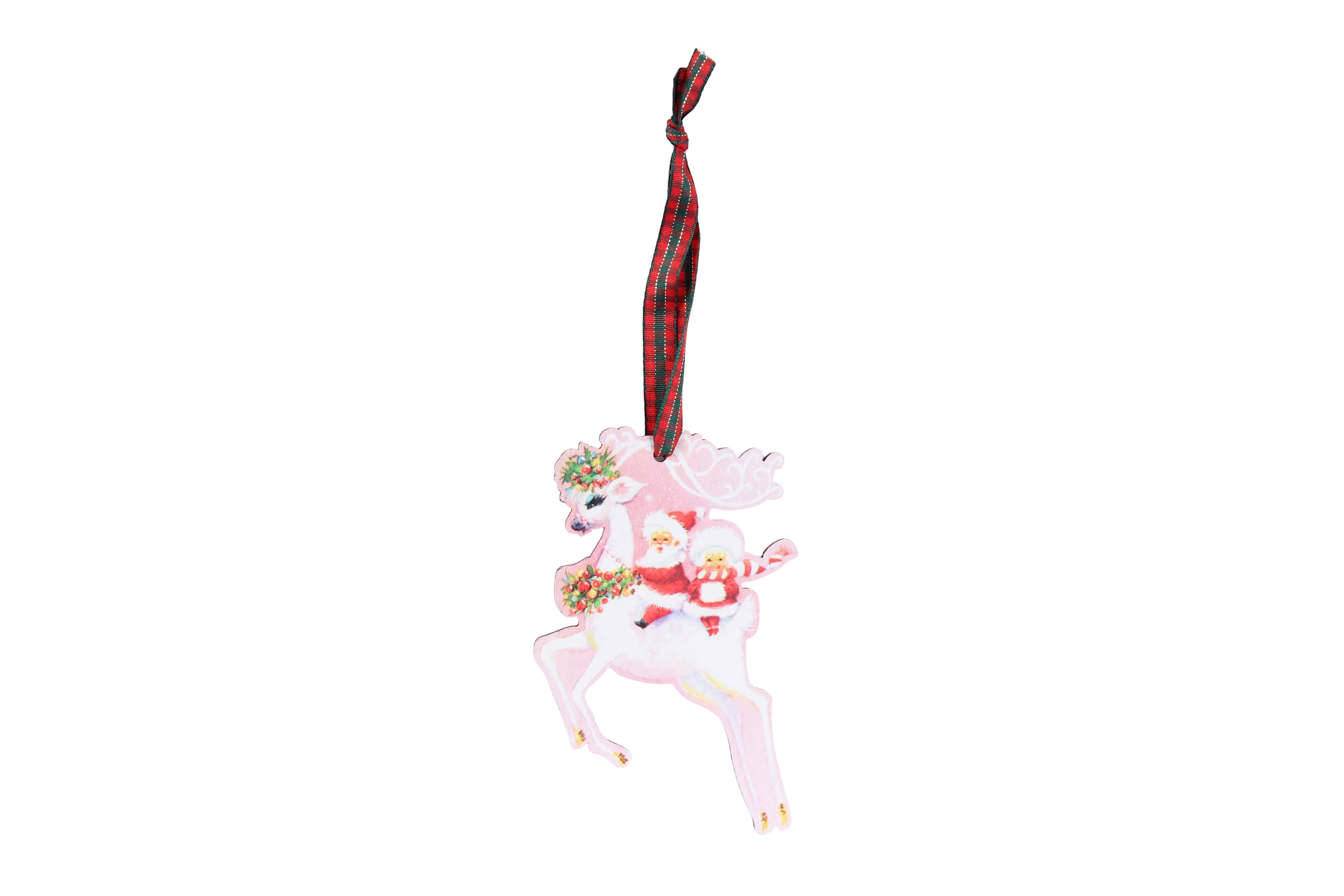 Bring whimsical holiday magic to your Christmas tree with this Santa and Mrs. Claus on White Reindeer Ornament! Featuring a joyful illustration of the beloved North Pole duo atop a majestic white reindeer, this ornament captures the enchantment, love, and charm of the holiday season in one unforgettable scene.