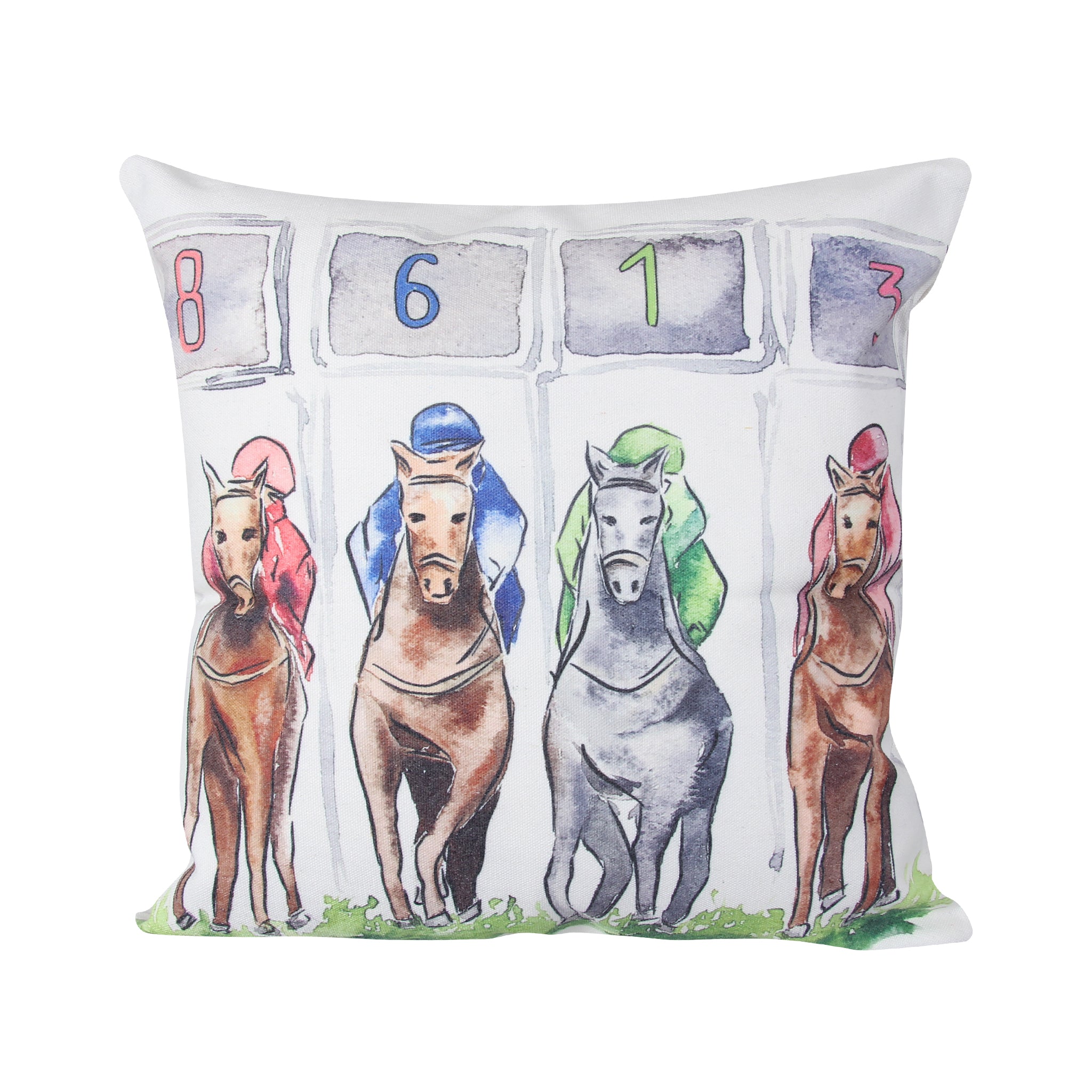 Saddle up for some serious style with this spirited Derby Day Out Of The Gate Horse Pillow! Watch as illustrated jockeys thunder out of the starting gate in a burst of action and excitement. Perfect for horse racing enthusiasts and sports fans alike, this playful design captures the thrilling energy of race day. Whether you're decorating a game room, man cave, or bedroom, this pillow brings a touch of equestrian charm and competitive spirit to any space. A fun conversation starter that celebrates the pageantry and passion of thoroughbred racing.