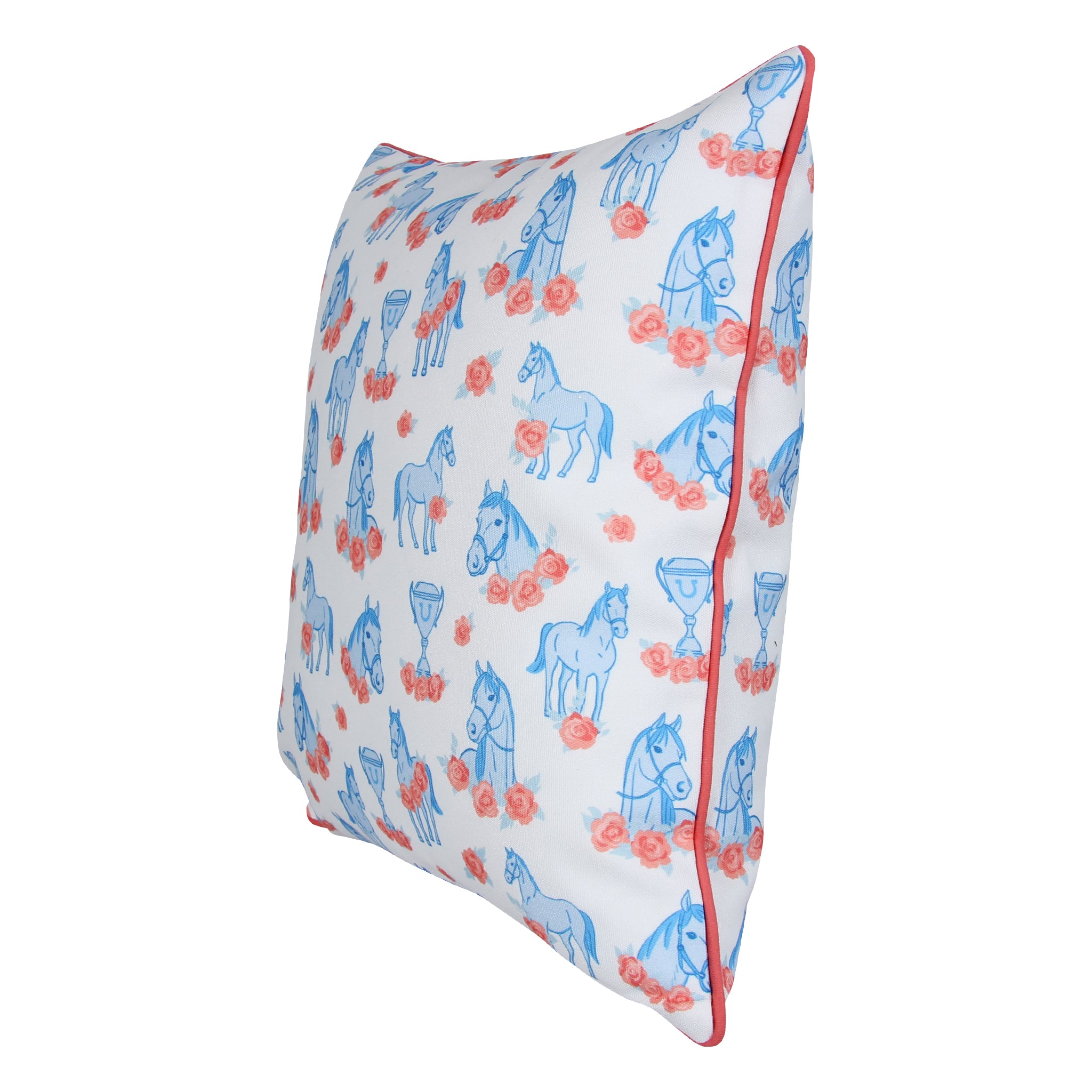 Celebrate the spirit of Derby season with this 18x18 pillow. Featuring an elegant pattern of blue racehorses, trophies, and red roses, this design captures the beauty and prestige of the winner’s circle in timeless Southern style.