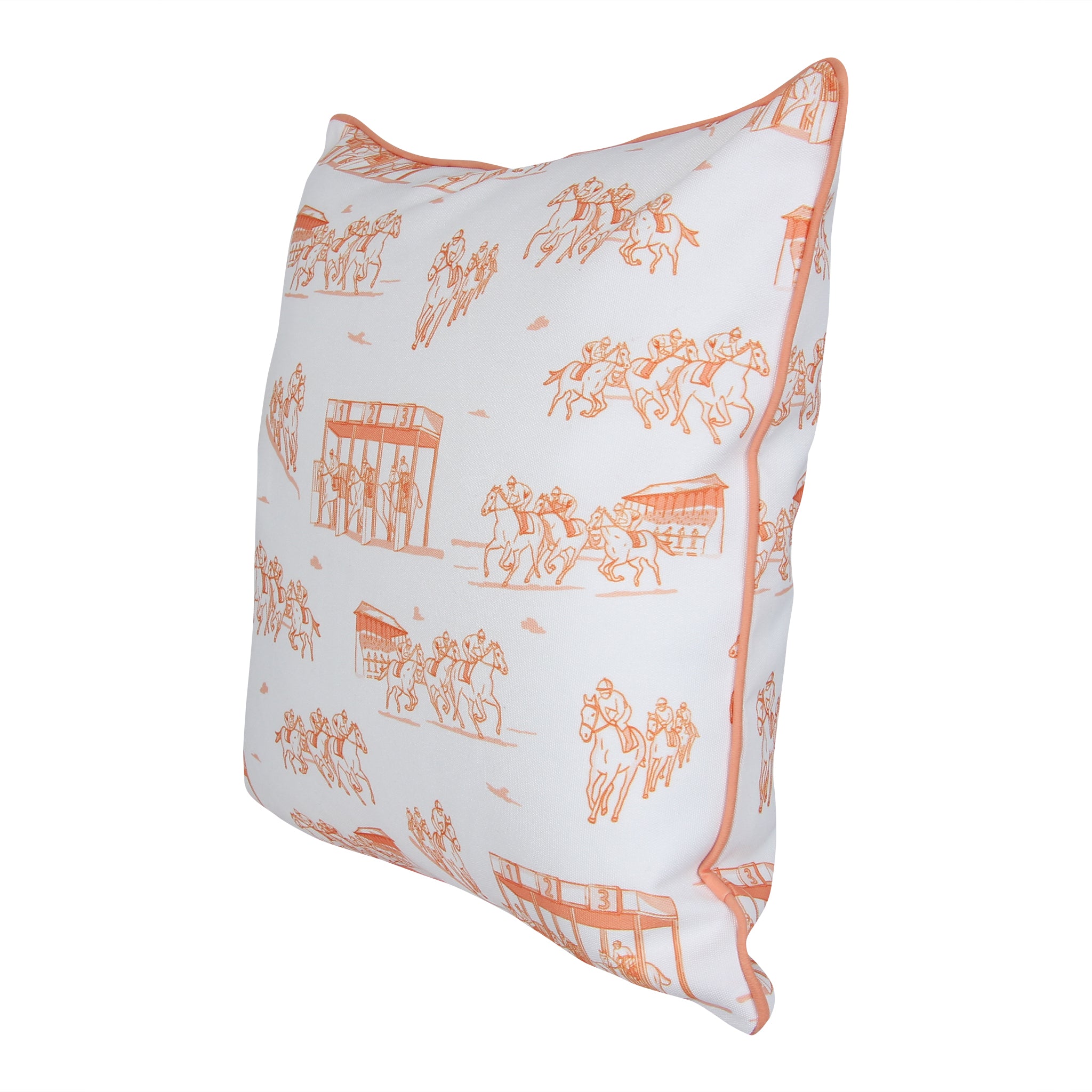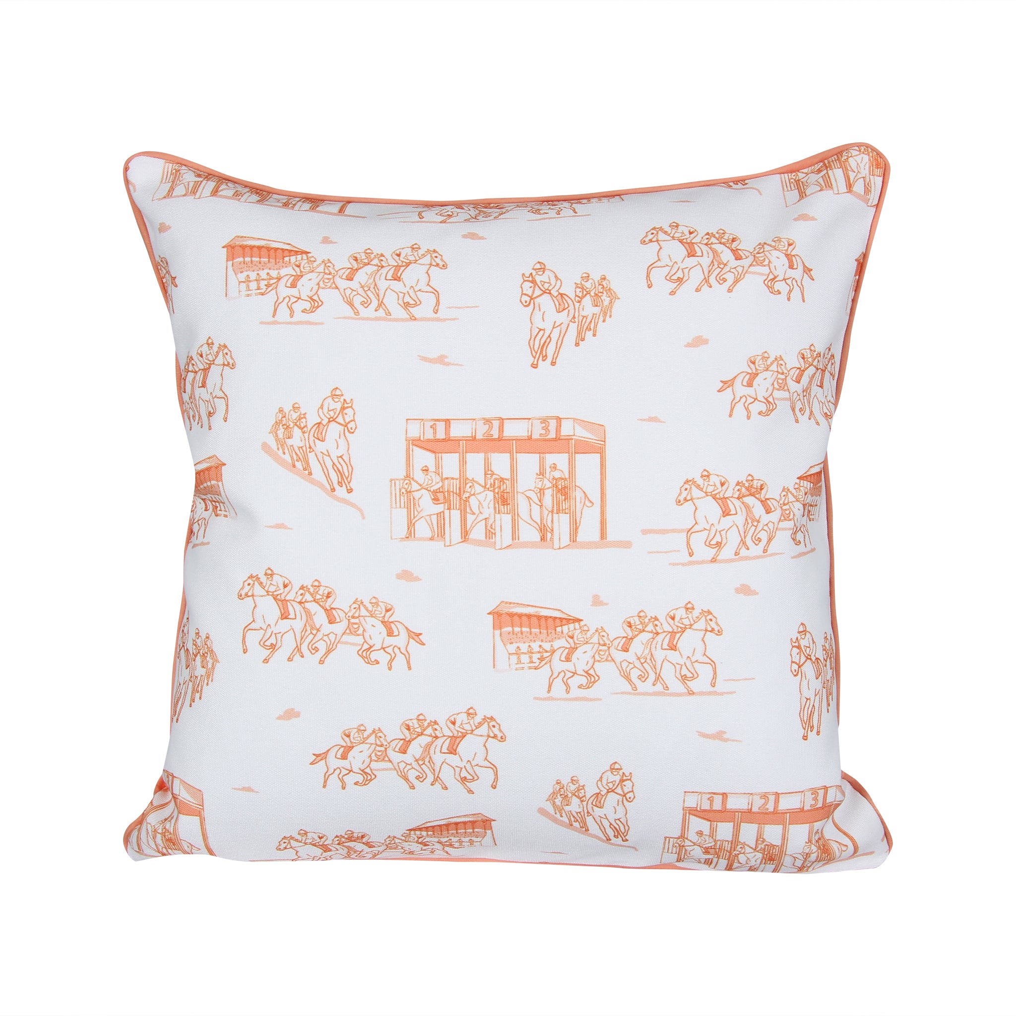 Capture the thrill of the track with this horse racing–inspired 18x18 decorative pillow. Illustrated in vibrant Derby orange, the design showcases detailed race scenes — from the starting gate to the final stretch — bringing energy and elegance to any space.