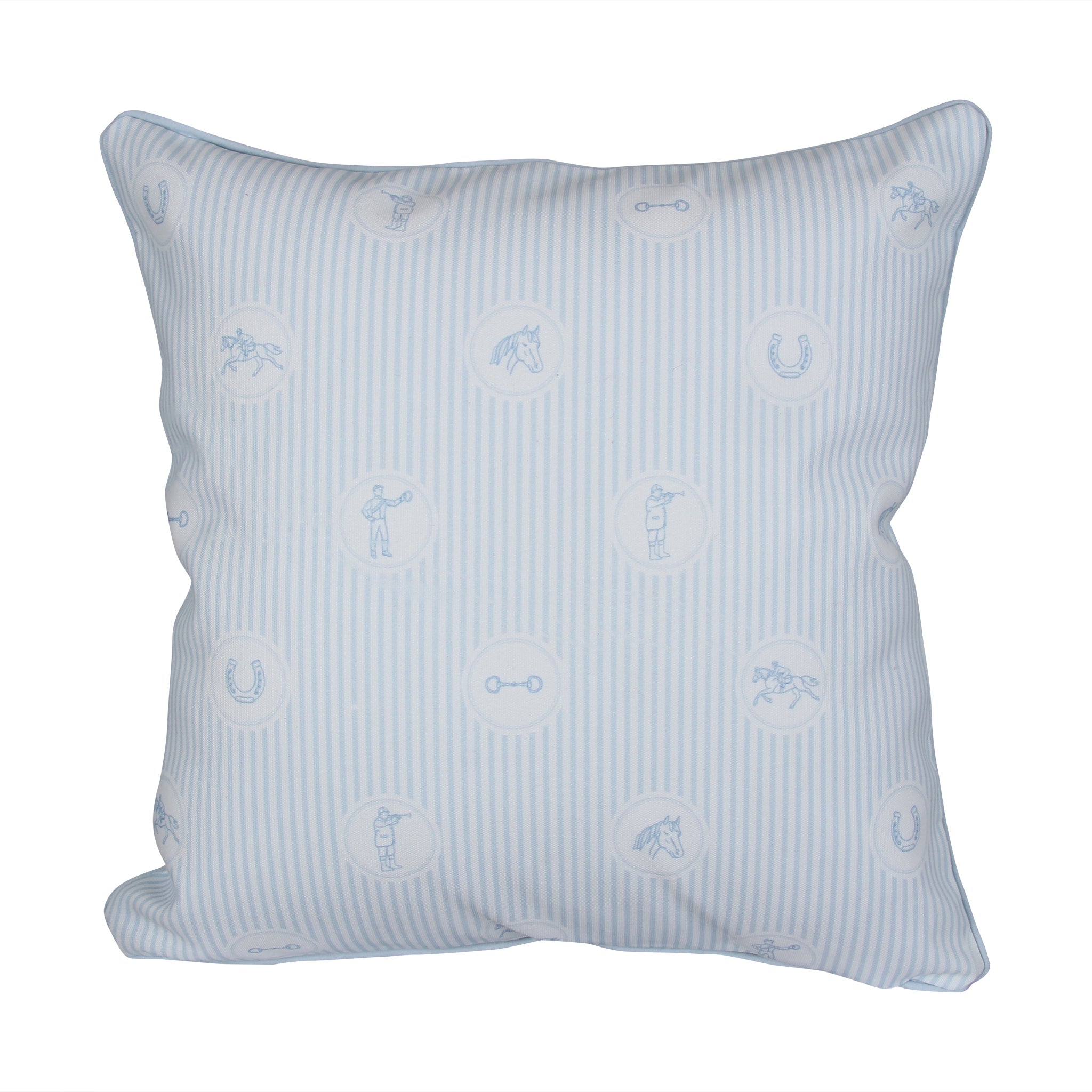 Celebrate classic equestrian style with this horse racing–inspired 18x18 pillow. Set against a soft blue and white pinstripe background, the design features a refined pattern of jockeys, horses, bits, horns, and horseshoes — a timeless nod to race day tradition.