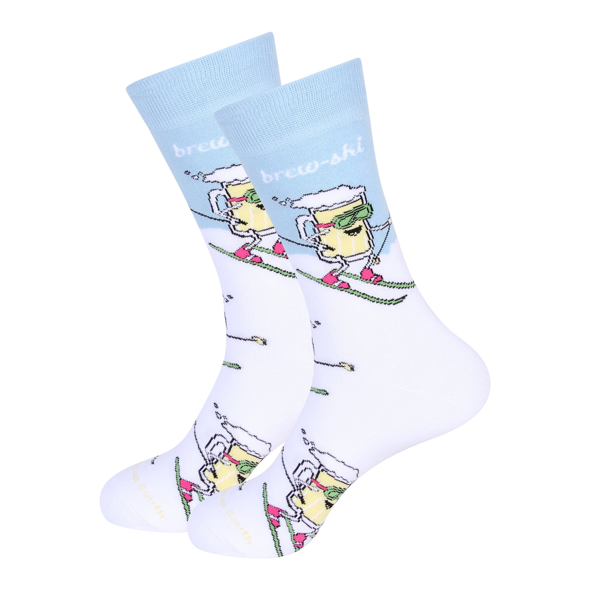 Bring together your love for craft beer and skiing with our playful Brew Ski Socks. Featuring a lively repeating pattern of beer glasses on skis paired with the clever “Brew-ski” text, these novelty socks are perfect for apres-ski enthusiasts, craft beer lovers, and anyone who enjoys a good time on and off the mountain.