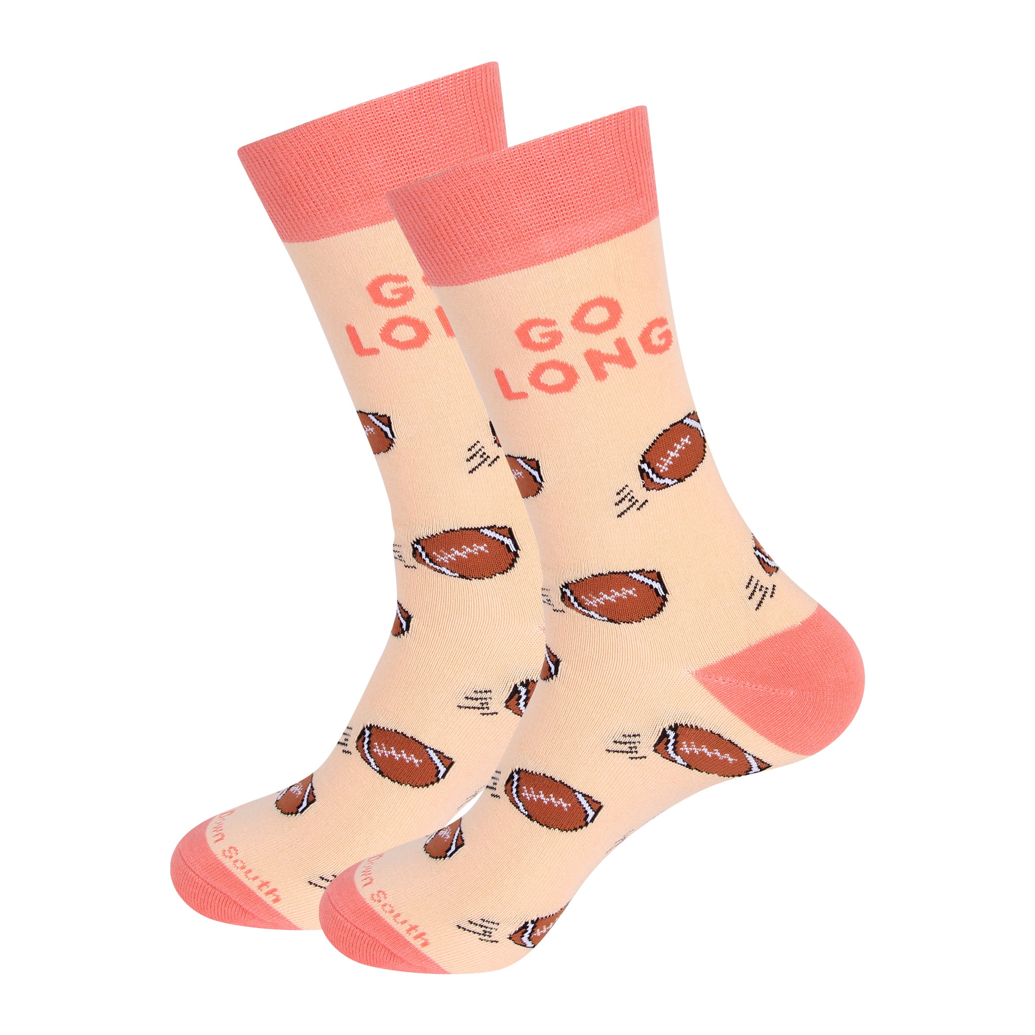 Score style points on and off the field with the Go Long Football Socks, featuring bold football-themed text and a fun repeating pattern of footballs set against a standout peach background. These playful socks bring game-day energy to your everyday wardrobe, making them perfect for sports fans, tailgaters, and anyone who lives for the big play.