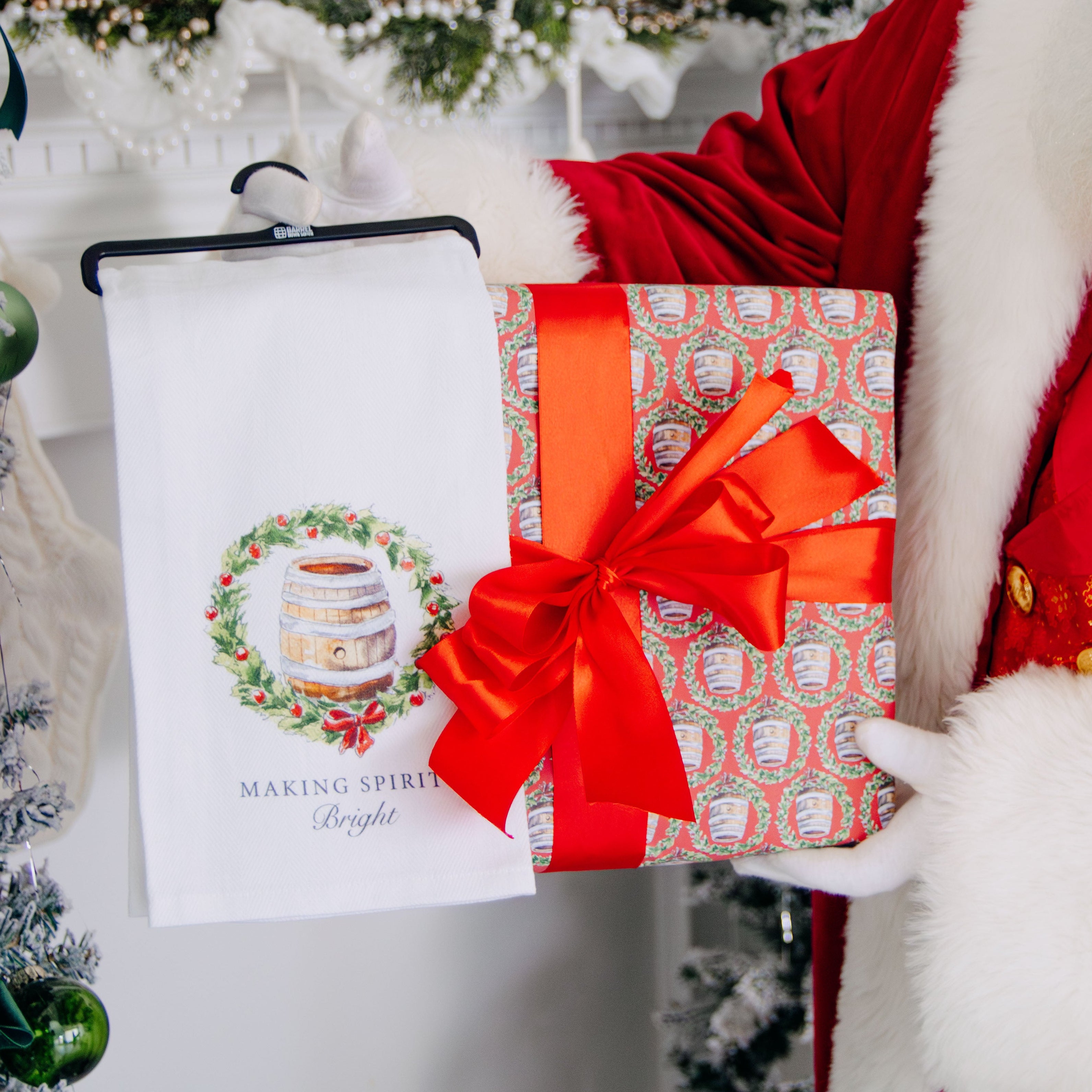 Spread holiday cheer with a bourbon twist using this clever Making Spirits Bright Tea Towel featuring a bourbon barrel nestled inside a festive wreath paired with the witty text "making spirits bright." Perfect for whiskey lovers and those who appreciate holiday humor, this playful design cleverly blends seasonal tradition with a love of fine spirits. The quality fabric makes it both functional and fun for your kitchen during the holidays and beyond. A spirited way to celebrate the season with style and a smile!