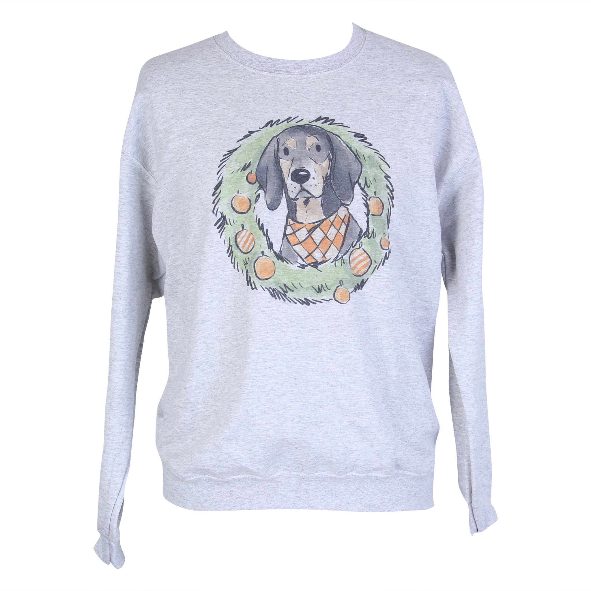 Celebrate the holiday season with this cozy heather gray crewneck featuring a watercolor bluetick coonhound inside a Christmas wreath.