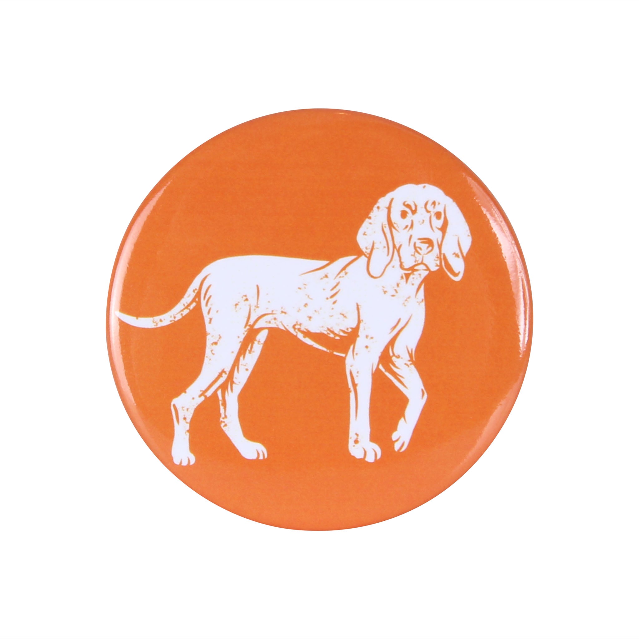 Show off your team spirit with this playful Orange Bluetick Coonhound Button Pin! Perfect for gameday tailgates, it adds a fun pop of color and personality to your outfit.