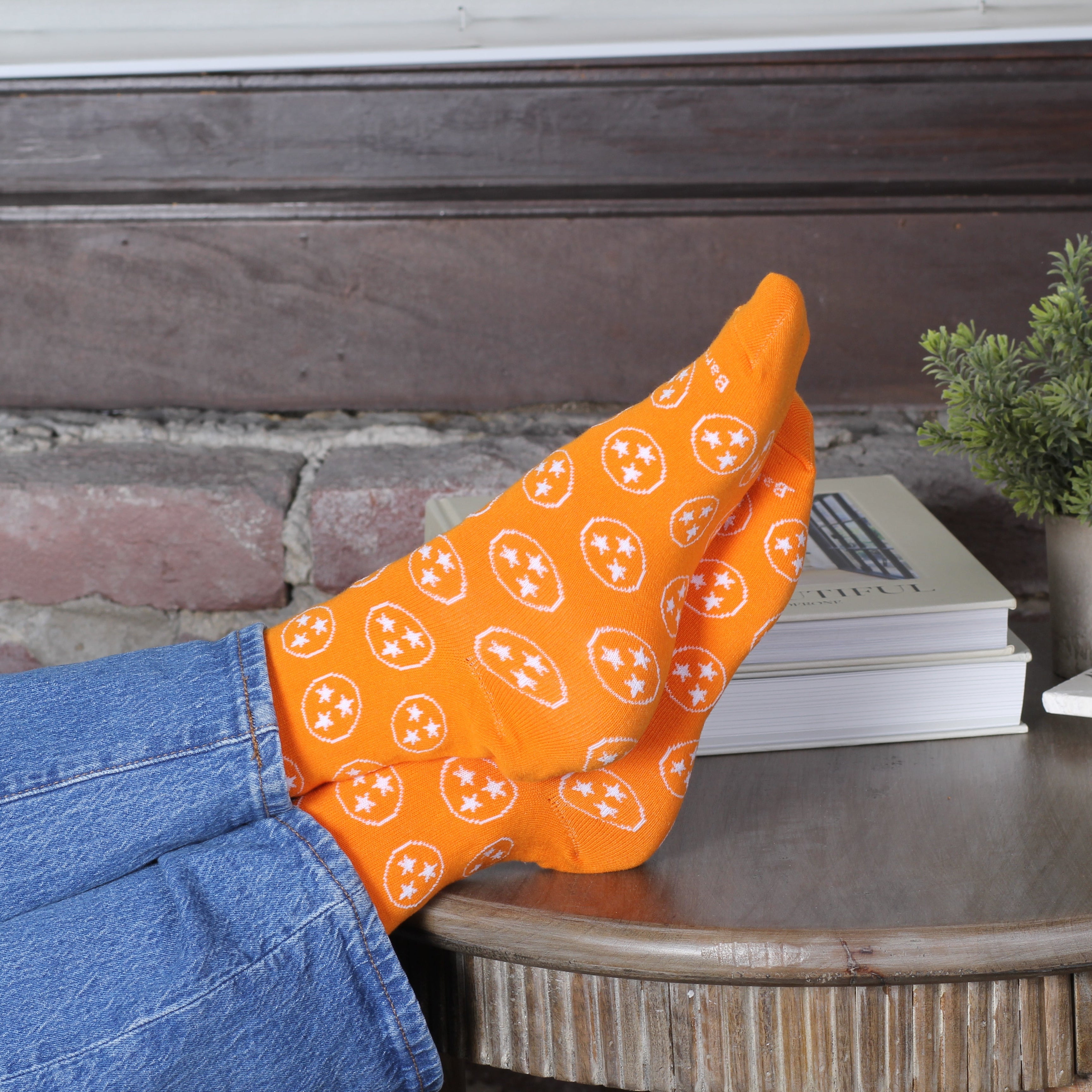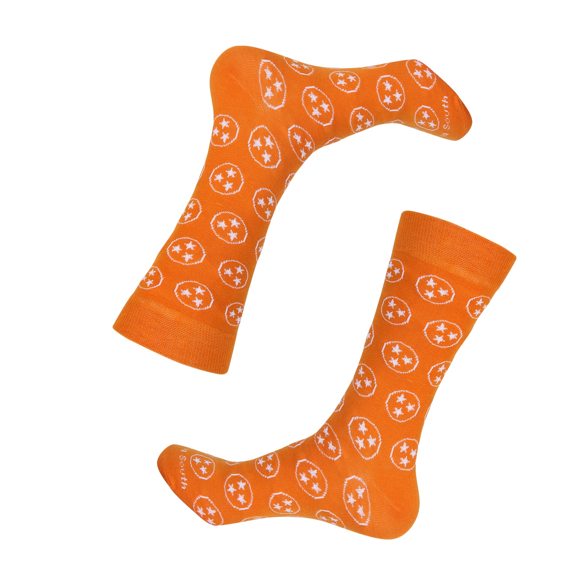 Show off your Tennessee roots with these bold Orange Tri Star Socks, featuring a repeating pattern of the iconic tri-star emblem set against a vivid orange background. Inspired by the unmistakable design of the Tennessee state flag, these standout socks are the perfect way to express your Volunteer spirit with every step.