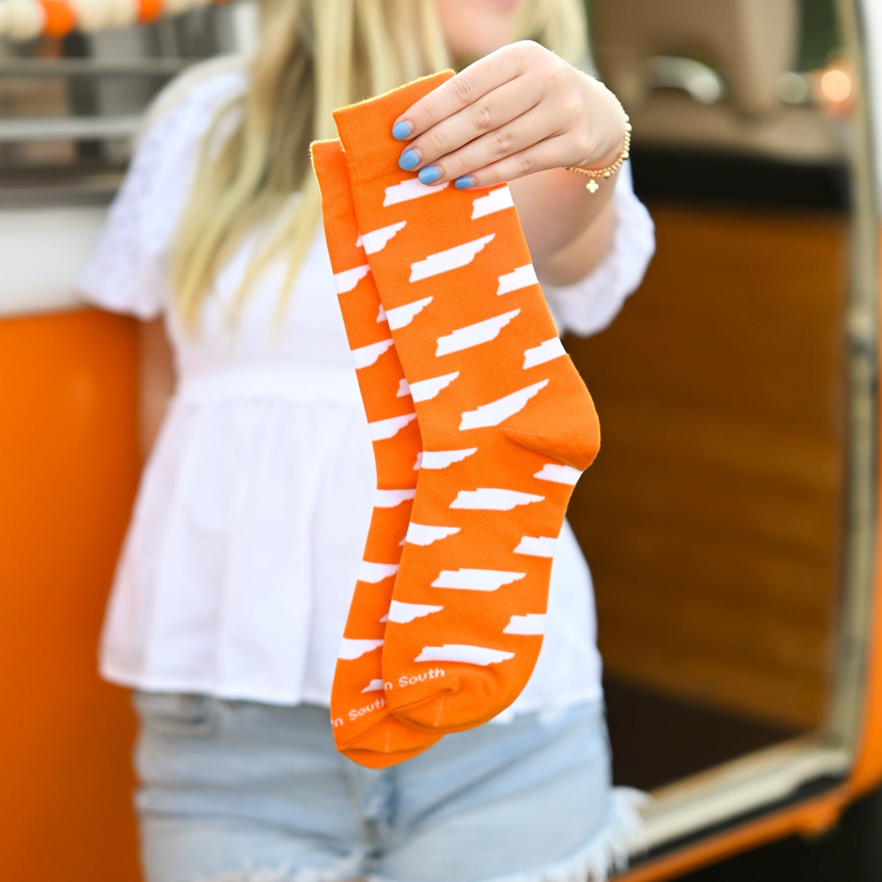 These Orange/White Tennessee Shape Socks are more than just a fashion accessory; they're a celebration of everything that makes Tennessee special. From the bustling streets of Nashville, where music fills the air, to the serene trails of the Great Smoky Mountains, these socks embody the spirit of the Volunteer State.
