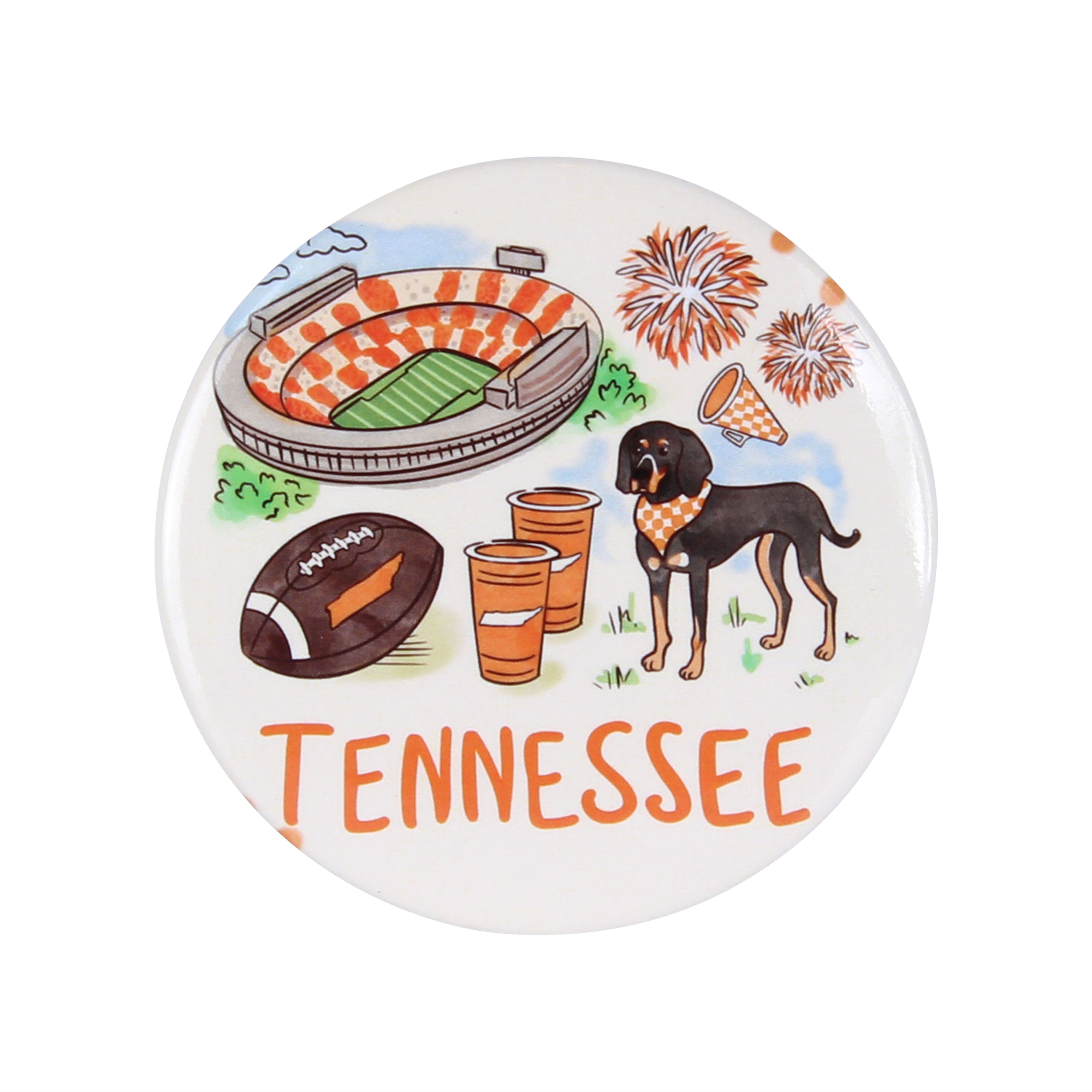 Show your Tennessee pride with the Tennessee Large Icons Button Pin. Featuring bold, recognizable symbols, this pin adds a standout touch to any outfit or accessory. Perfect for fans, travelers, or anyone wanting to celebrate the Volunteer State, it’s a simple way to express your connection and style wherever you go. Durable and eye-catching, this pin makes a great gift or personal keepsake.
