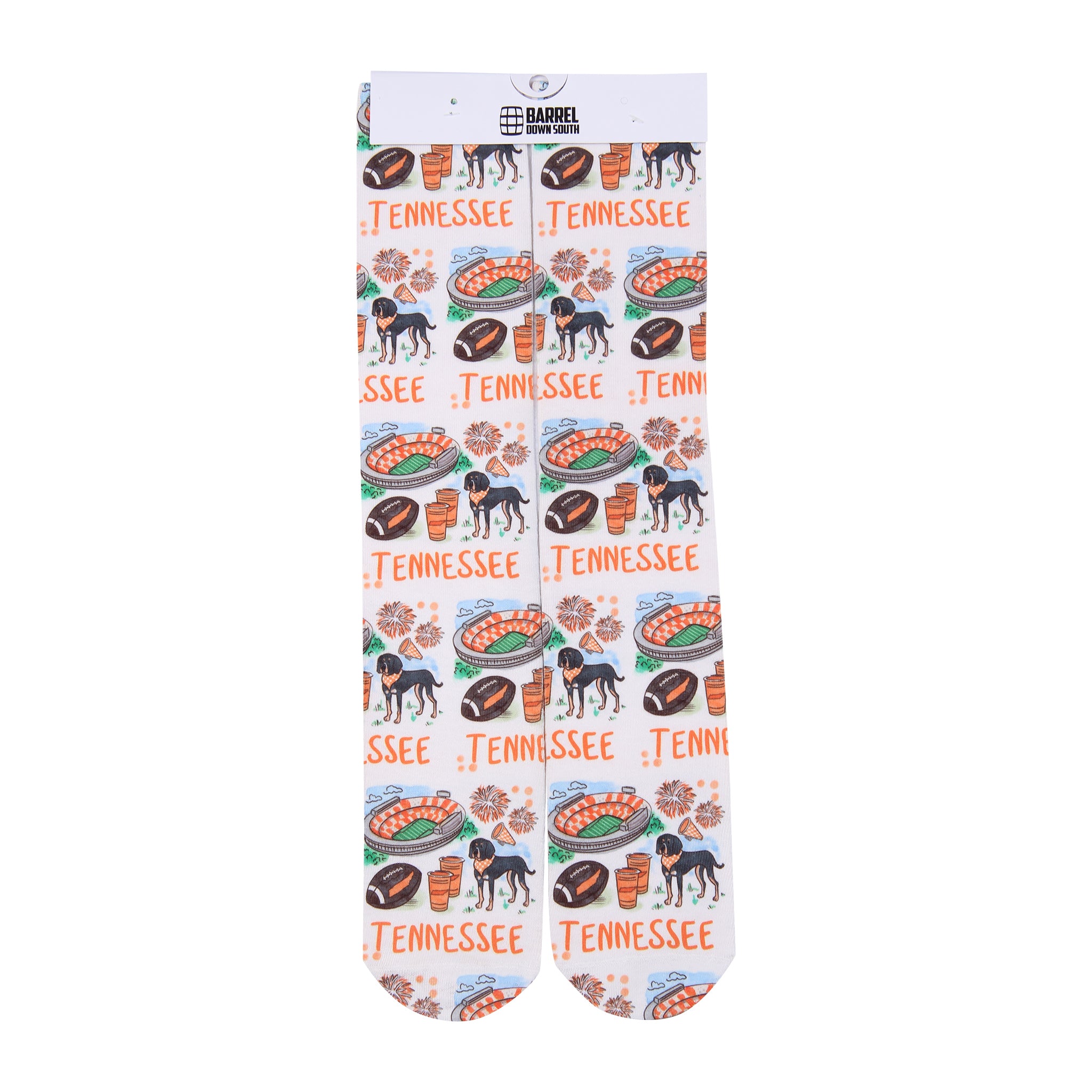 Show your Tennessee pride from head to toe with these Large Icons Printed Socks. Featuring bold, vibrant designs of iconic Tennessee symbols, these socks add a spirited touch to any outfit. Crafted for comfort and durability, they keep your feet cozy while making a statement. Perfect for game days, casual wear, or as a unique gift for any Tennessee fan. Step into style and support with every step you take.