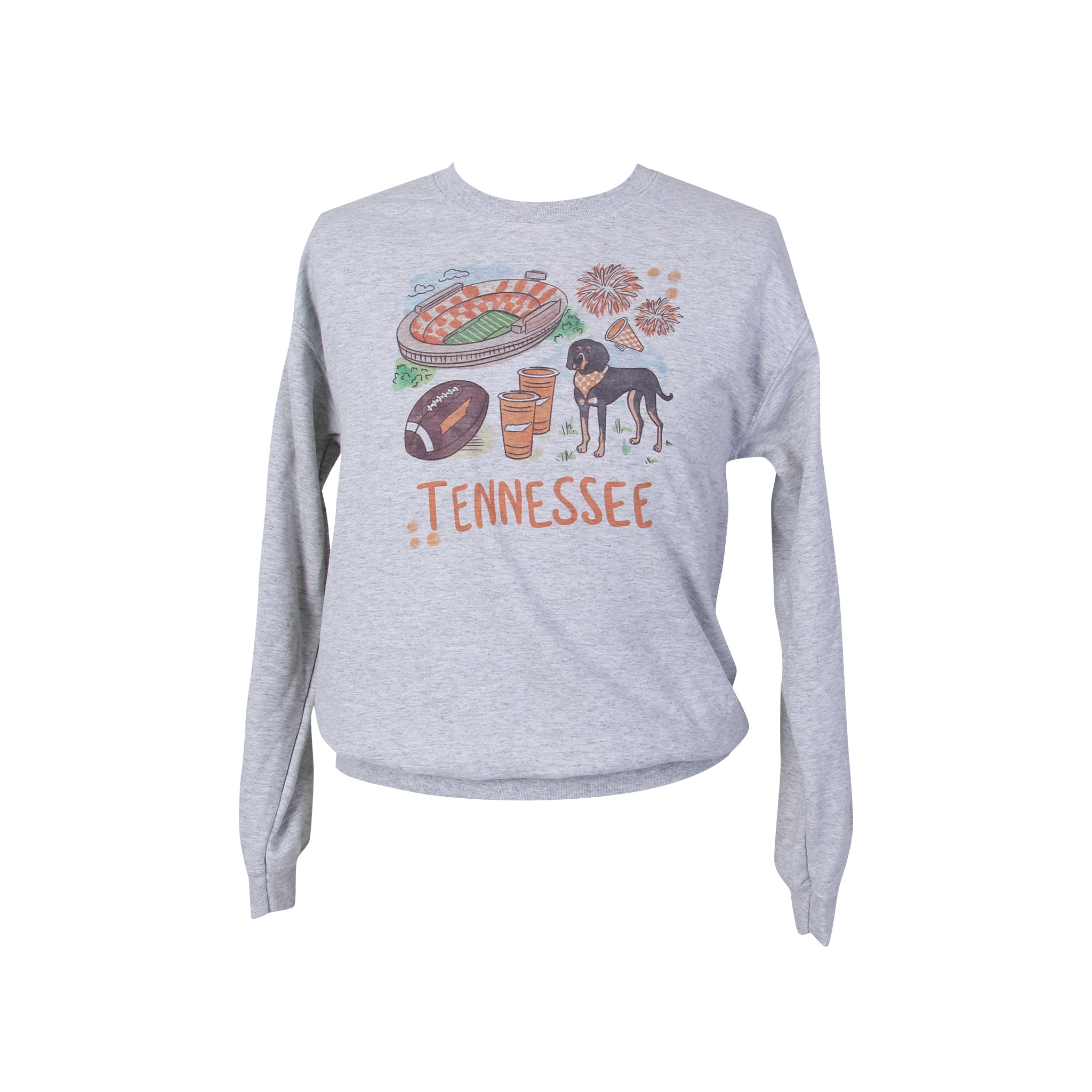 Celebrate fall Saturdays in the South with this cozy heather gray crewneck featuring a watercolor Tennessee game day scene — complete with a stadium, a football, cups, pom poms, and the beloved Bluetick Coonhound. Finished with cheerful “Tennessee” lettering in orange, this sweatshirt captures the true spirit of game day in Knoxville.