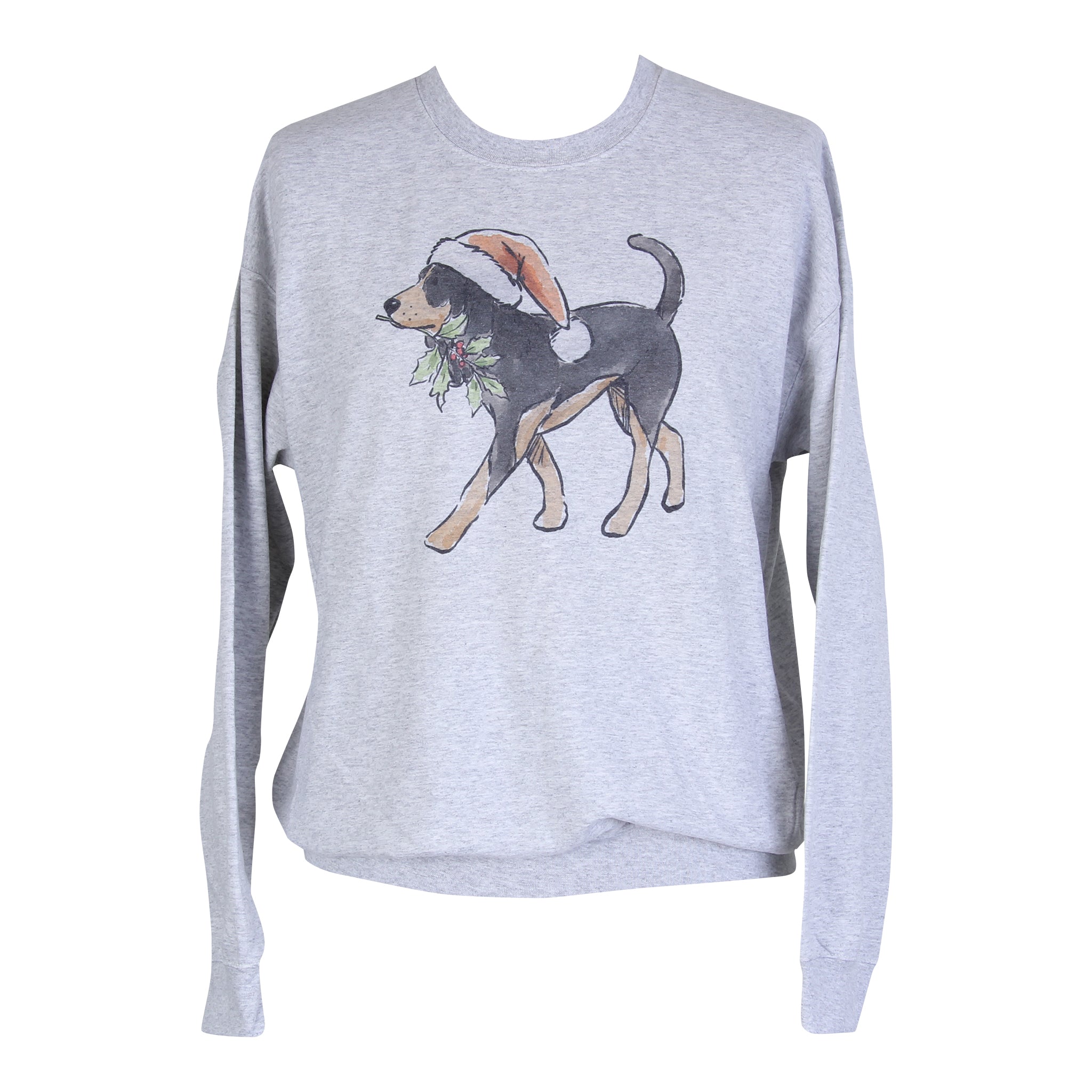 Celebrate the holiday season with this cozy heather gray crewneck featuring a watercolor bluetick coonhound wearing a festive orange Santa hat and carrying holly.