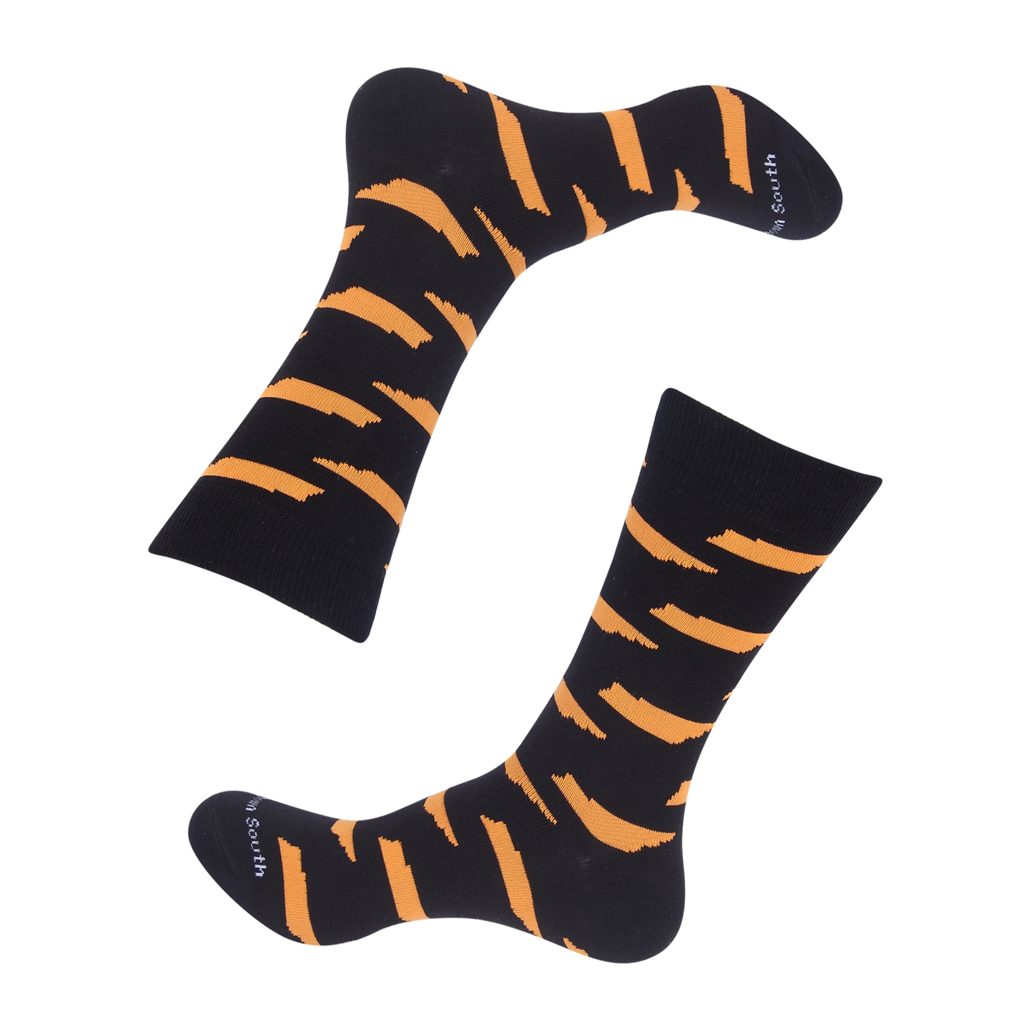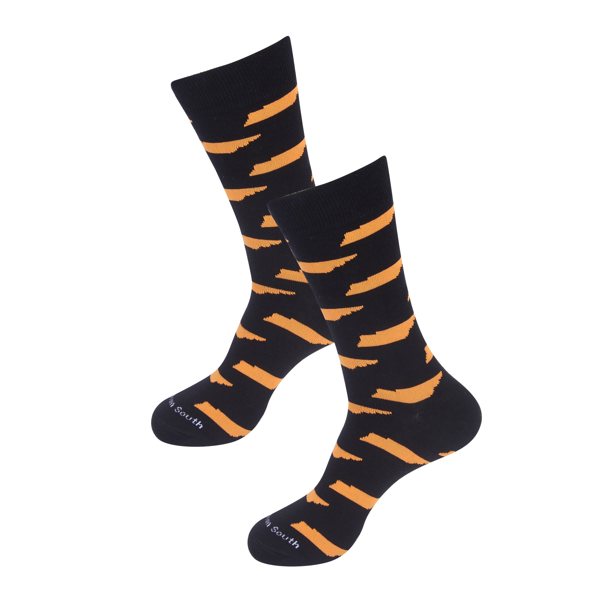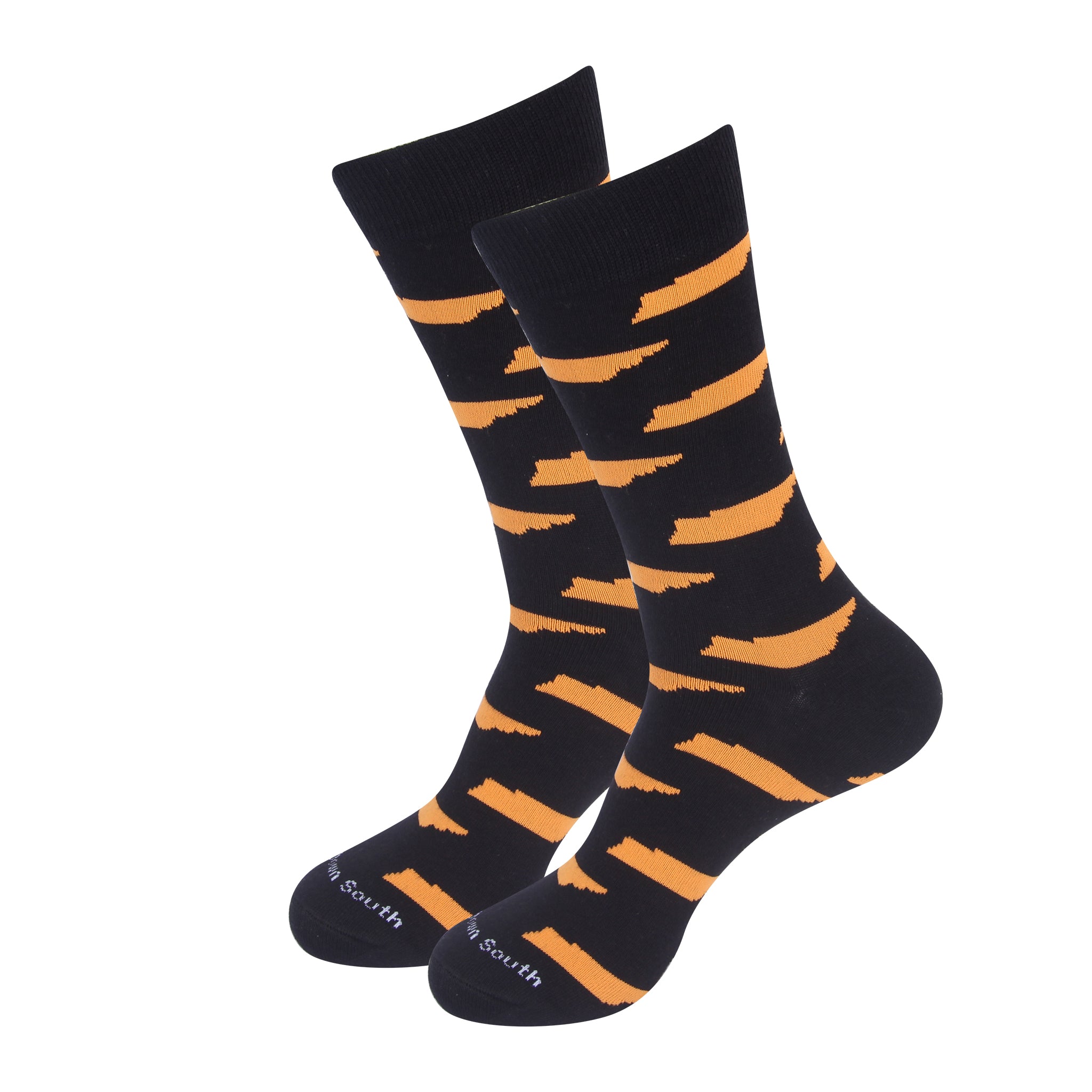 These Black/Orange Tennessee Shape Socks capture the essence of Tennessee's diverse landscape, from the vibrant music scenes in Nashville and Memphis to the natural beauty of the Appalachian Mountains. The bold black and orange colors make a striking statement, while the state-shaped design adds a touch of local pride. Perfect for daily wear or special occasions, these socks are a must-have for any Tennessean or fan of the state.