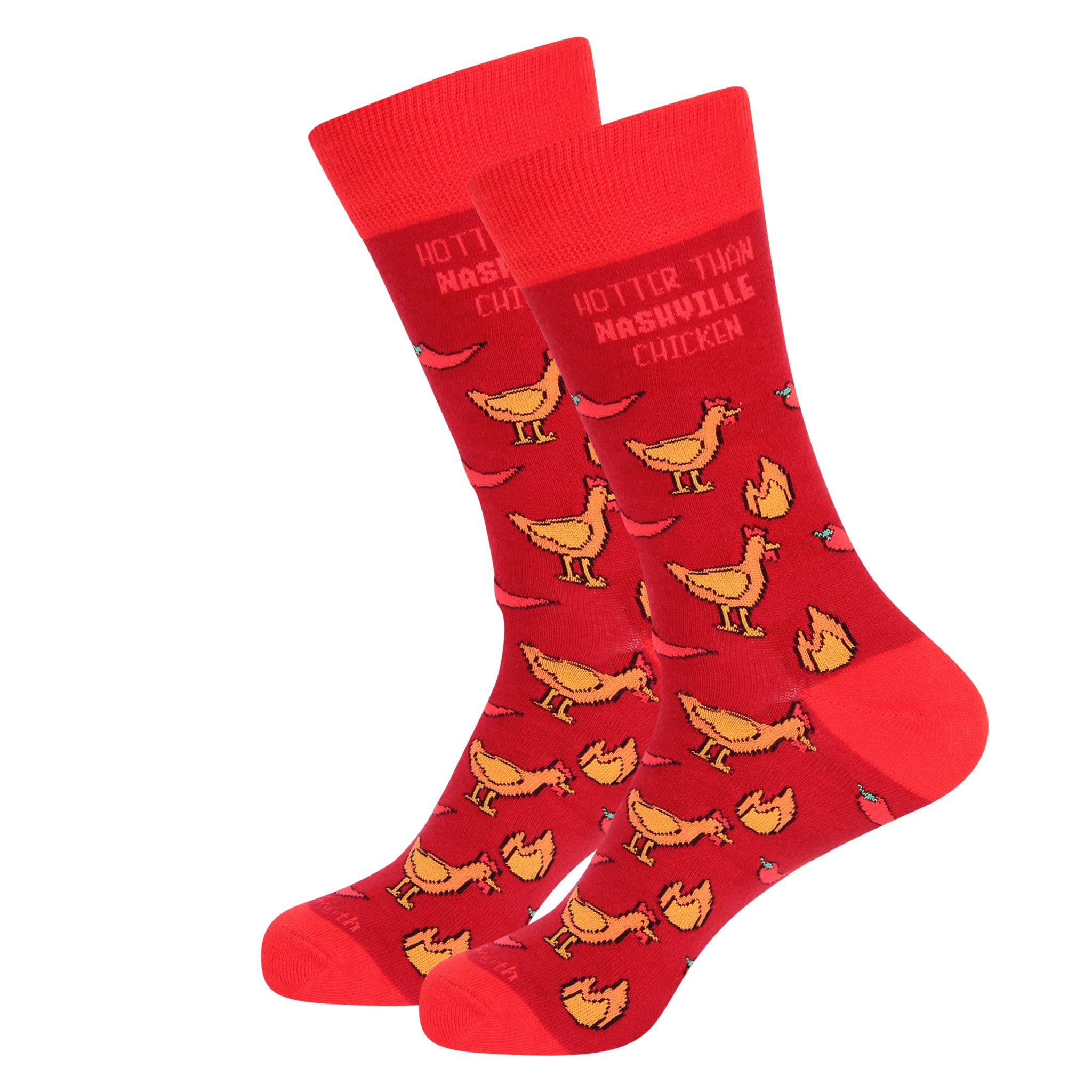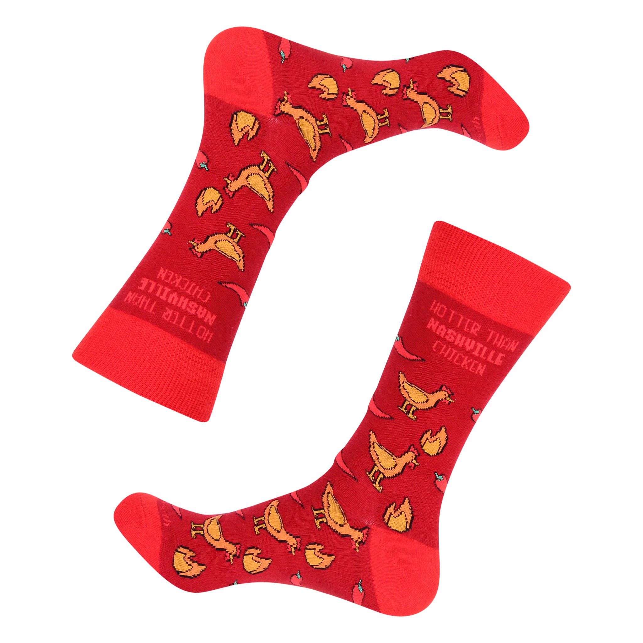 Add a spicy twist to your sock game with these Hotter Than Nashville Chicken Socks. Featuring bold, fiery designs inspired by Nashville’s famous heat, they bring fun and flair to every step. Perfect for those who like a little kick in their style and a lot of comfort on their feet.
