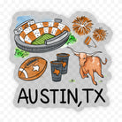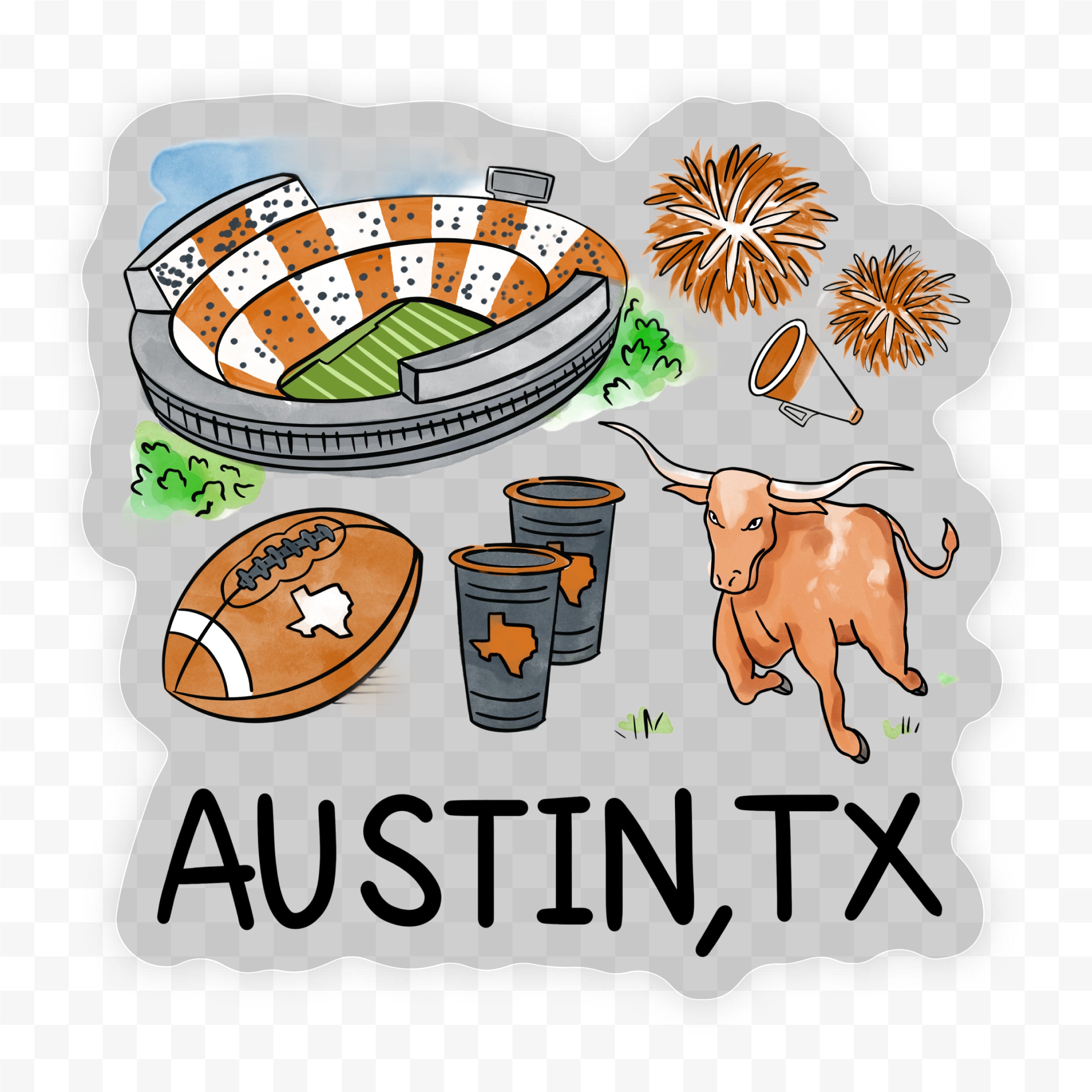 Bring a little Texas spirit wherever you go with this Austin, Texas, game day sticker. Featuring hand-drawn illustrations of a stadium, longhorn steer, pom-poms, megaphone, football, and state-themed cups, it’s perfect for showing your love for this lively football town.