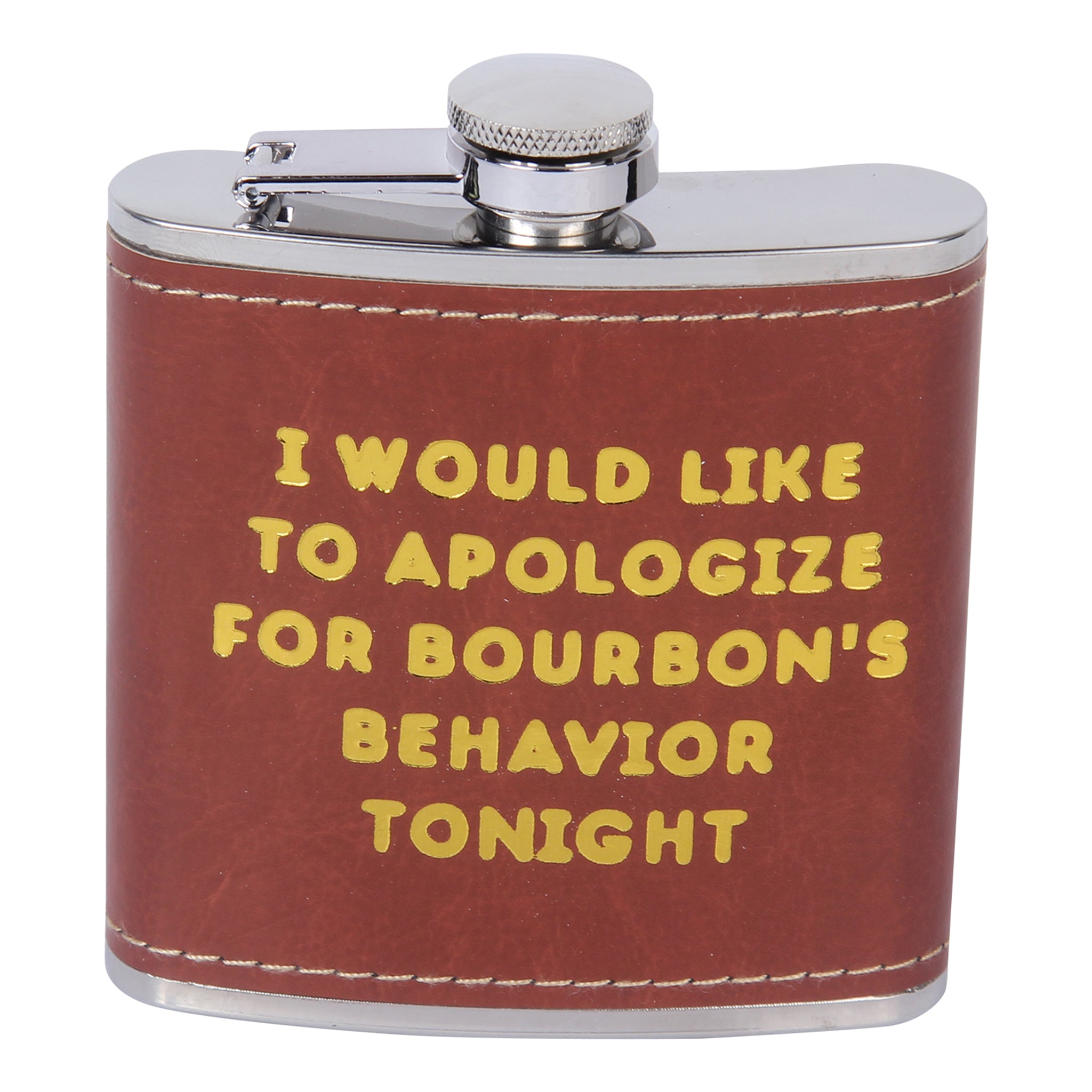 Carry your favorite spirit with a sense of humor in this Apologize For Bourbon Flask. Featuring the witty engraving "I would like to apologize for bourbon's behavior tonight" in elegant gold lettering, it's the perfect companion for anyone who appreciates a good laugh alongside their drink. Durable faux leather construction keeps your beverage secure while the humorous message makes it an ideal gift for bourbon lovers and party enthusiasts alike.