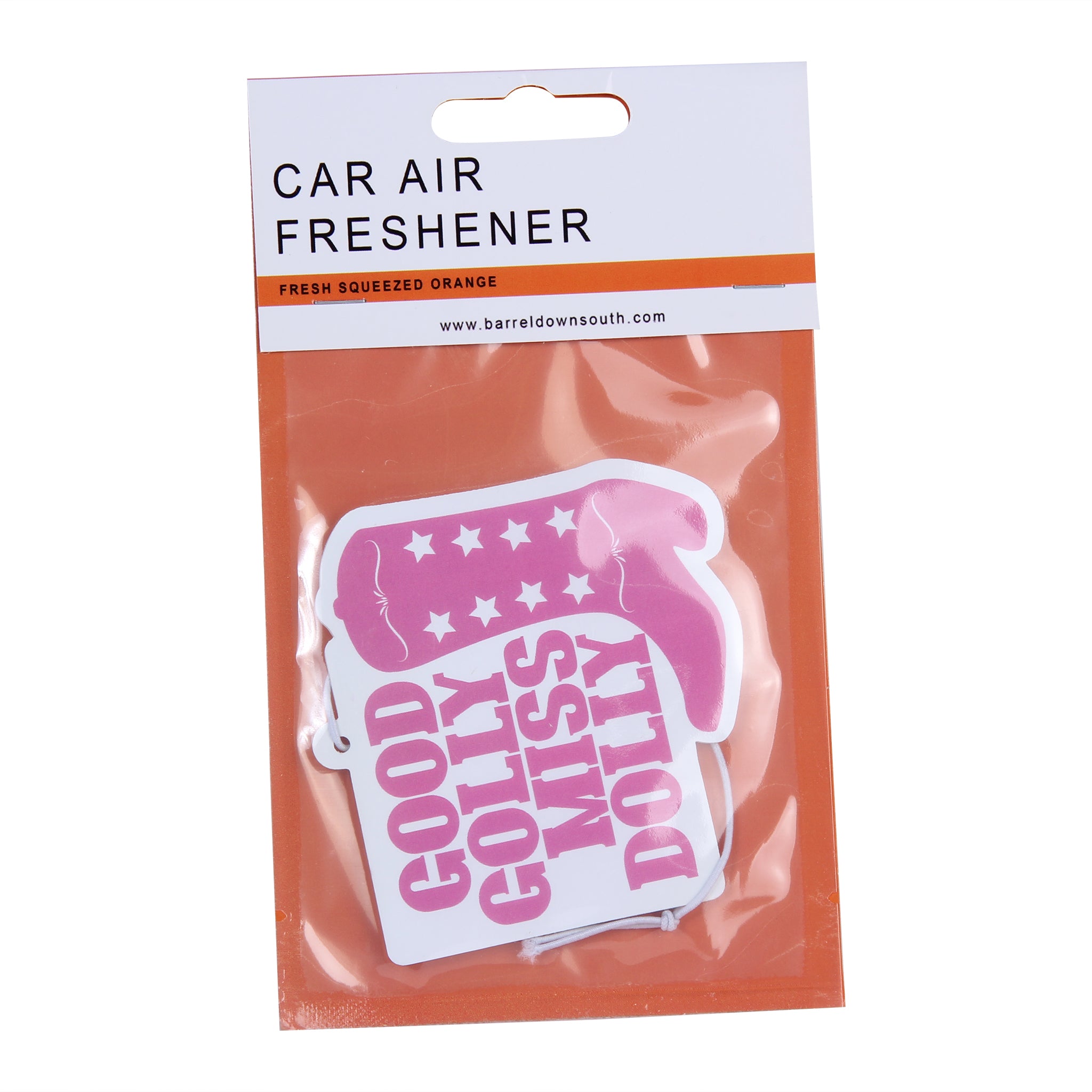 Bring a little country charm to your ride with this Good Golly Miss Dolly Air Freshener. Featuring the fun phrase "Good Golly Miss Dolly" paired with a vibrant pink cowboy boot illustration, it's the perfect accessory for anyone who loves bold, quirky style. Keep your car smelling fresh while showing off your personality with this unique, eye-catching design that's sure to spark conversations on the road.