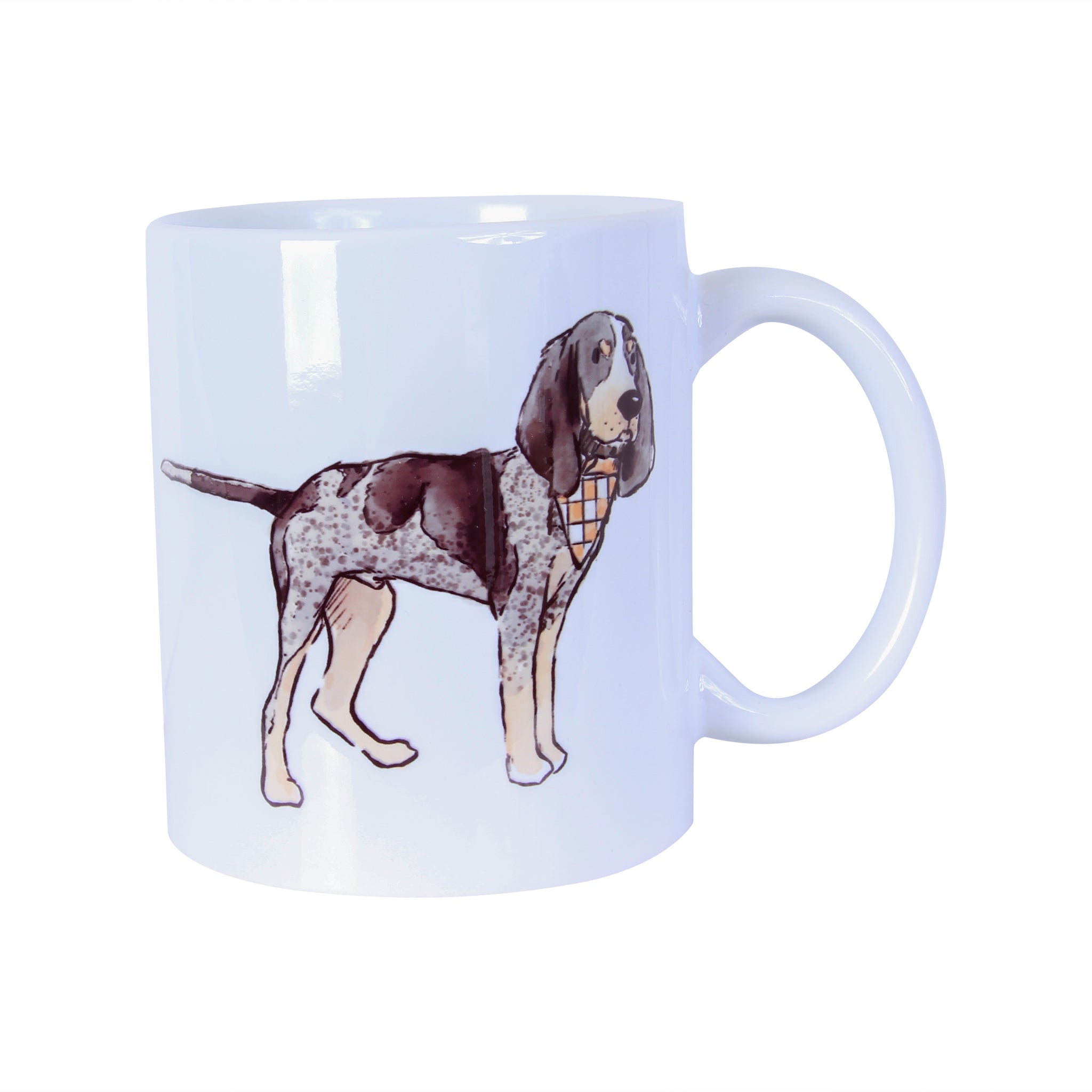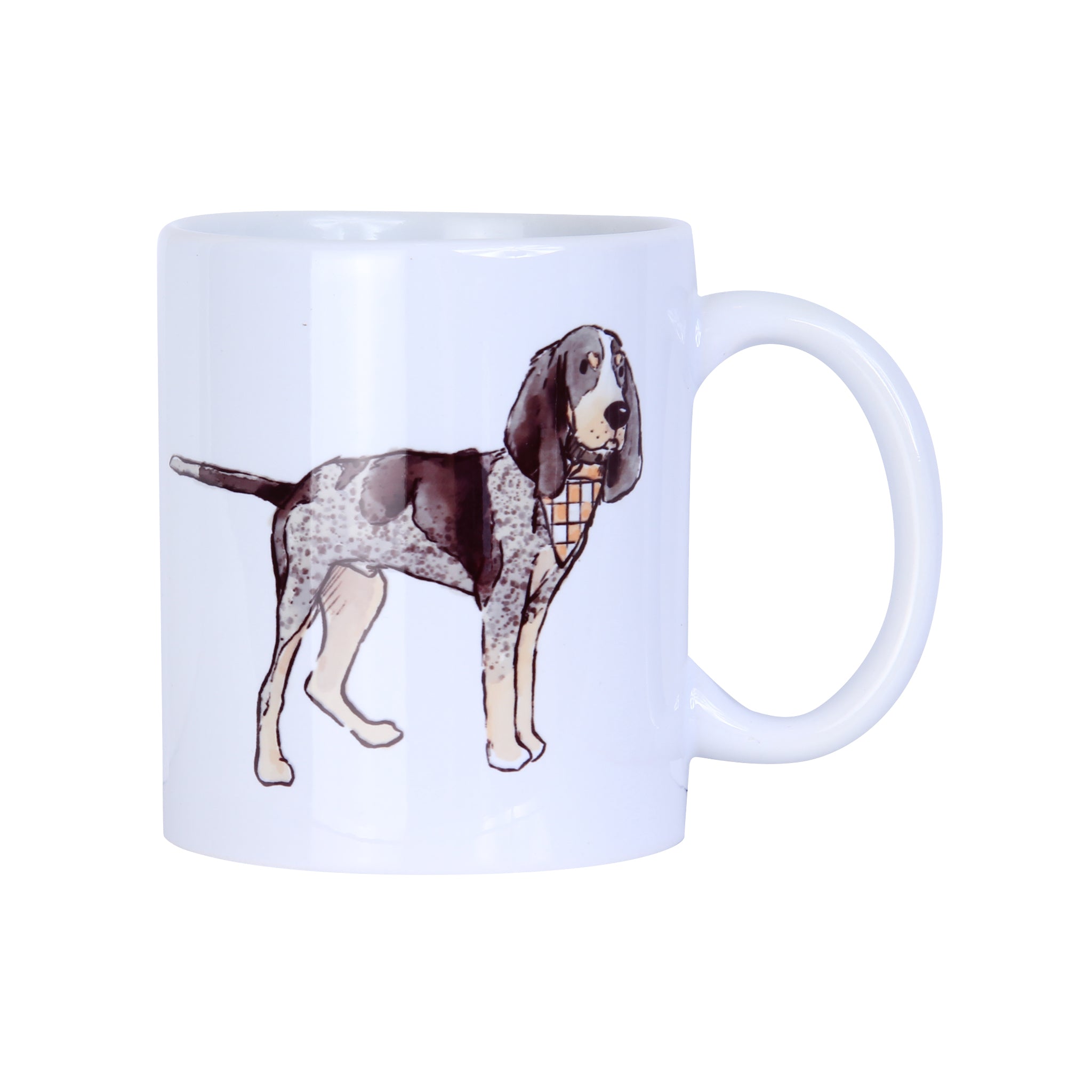 Start your morning with a smile! This Bluetick Coonhound Coffee Mug showcases a charming bluetick coonhound decked out in a vibrant orange and white checkerboard bandana. Perfect for dog lovers and Southern charm enthusiasts alike, it's ideal for your favorite hot beverage. Durable and dishwasher-safe, this playful mug brings personality to your daily coffee ritual.