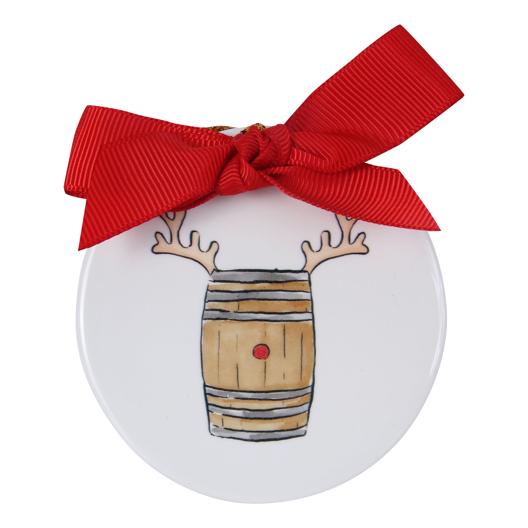 Spread holiday cheer with this playful ceramic ornament featuring a bourbon barrel decked out with a red nose and reindeer antlers. Tied with a festive red bow, it’s a fun and spirited addition to your seasonal decor.
