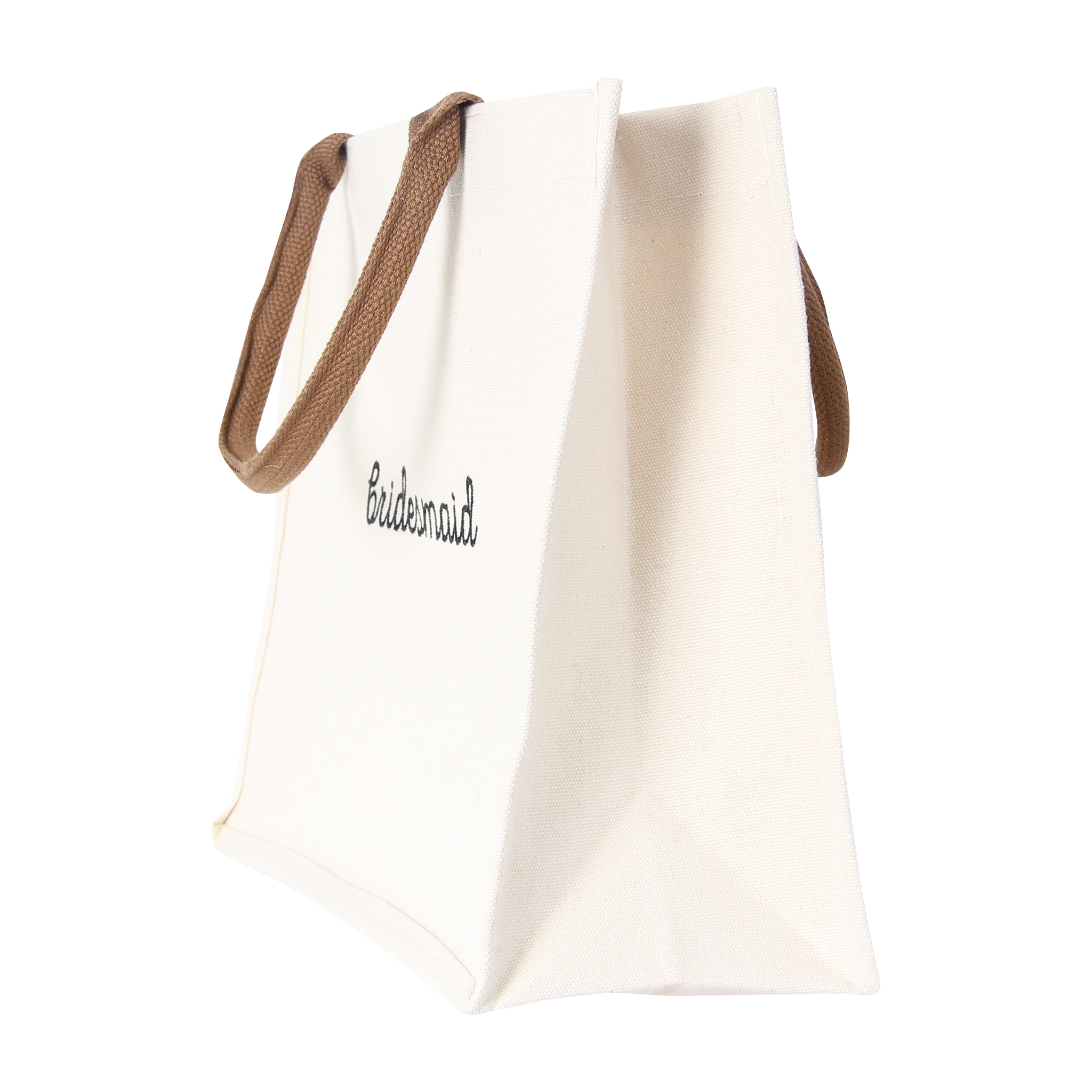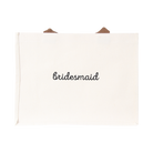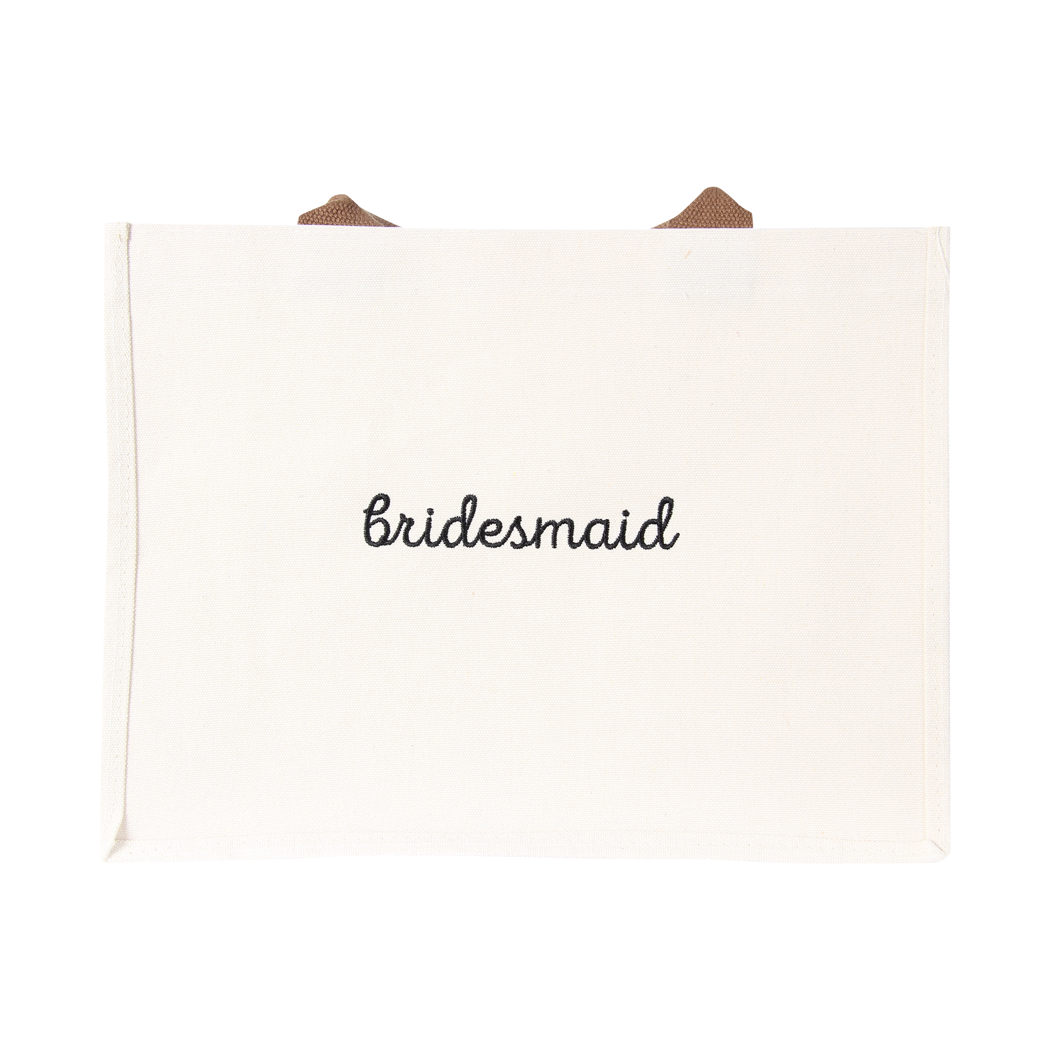 Give your bridal party a gift they’ll actually use with this chic laminated canvas tote embroidered with the word “bridesmaid.” Practical and stylish, it features a wipe-clean finish for durability and sturdy brown handles for easy carrying. Spacious enough for wedding day essentials, bachelorette party goodies, or everyday errands, this tote is both functional and meaningful. A perfect keepsake for bridesmaids that combines sentiment with practicality.