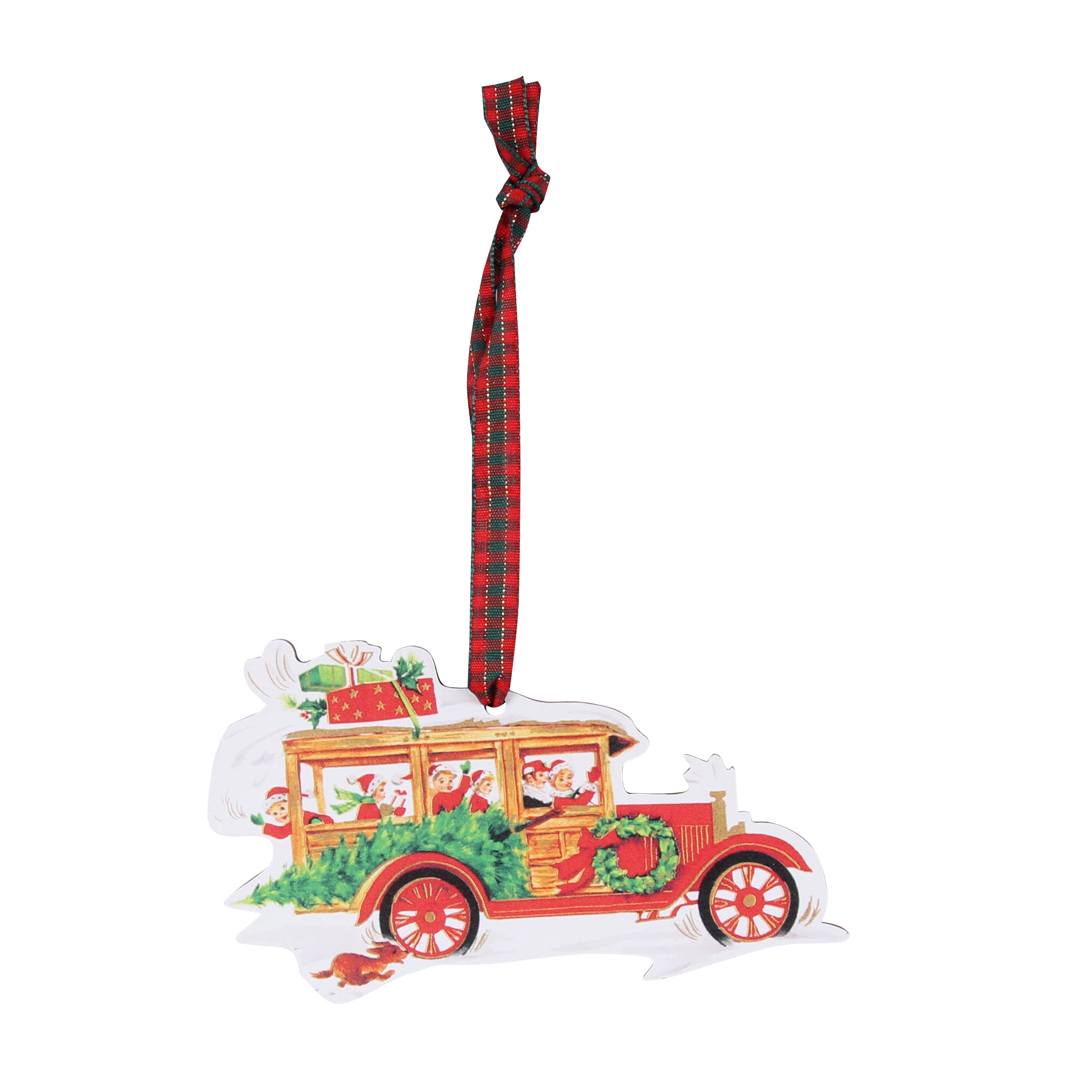 Get ready to drive some holiday cheer into your décor with this charming Car With Tree Ornament featuring a group of festive people riding in a vintage car with a Christmas tree and presents tied to the roof. This nostalgic design captures the excitement of a classic holiday road trip: bundled-up passengers, twinkling gifts, and a freshly cut tree ready for decorating.